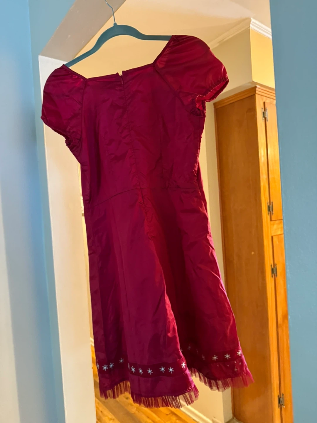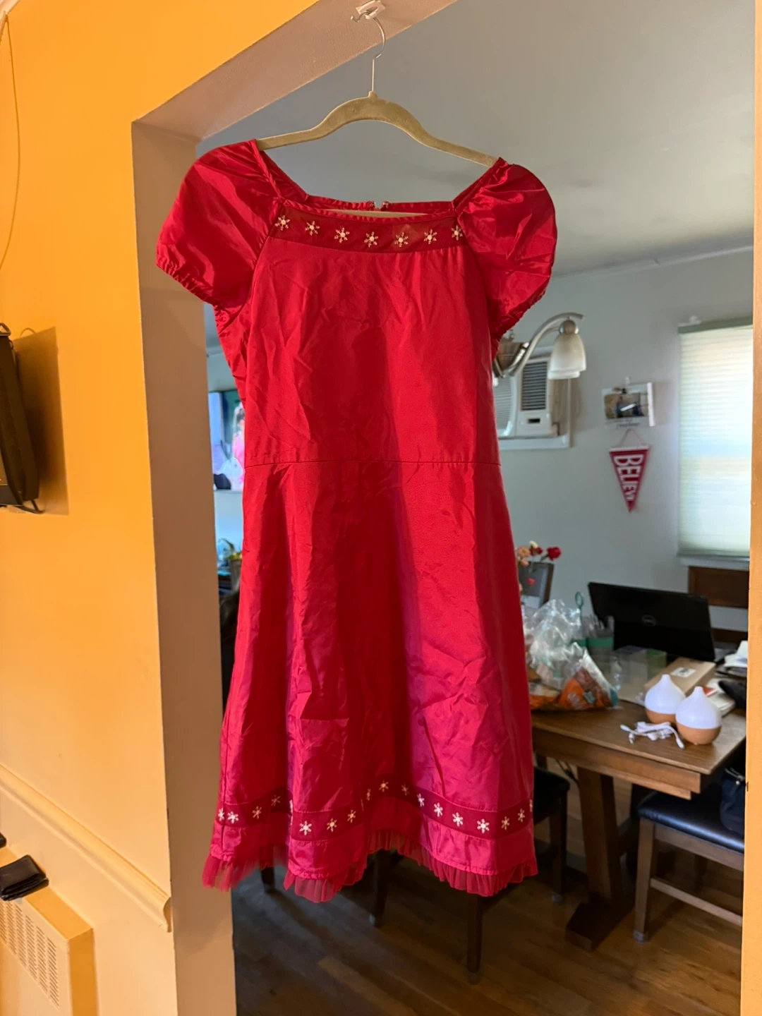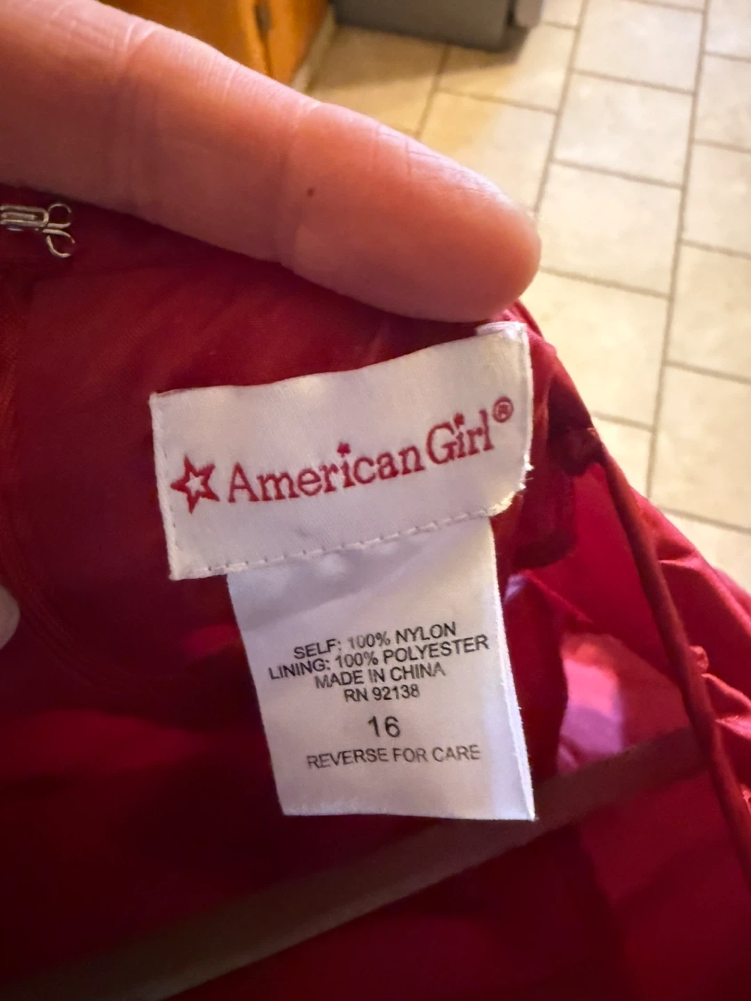 Selling an American Girl red dress in size 16. It's made with 100% nylon and has a polyester lining