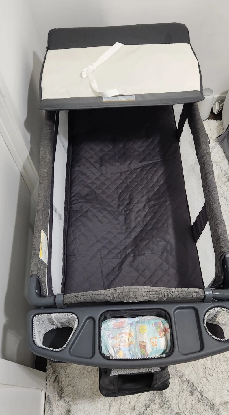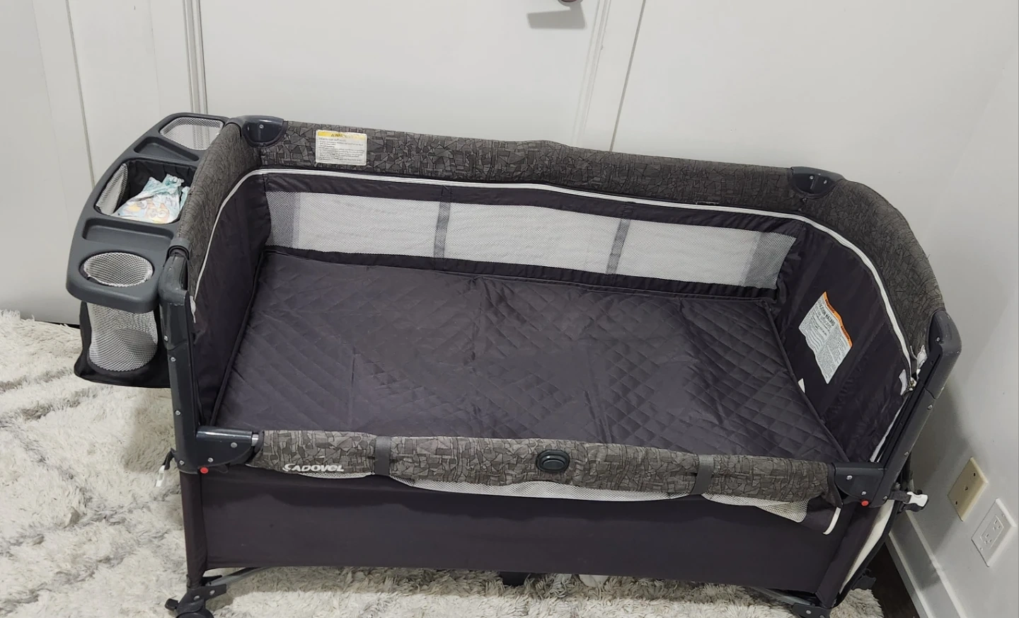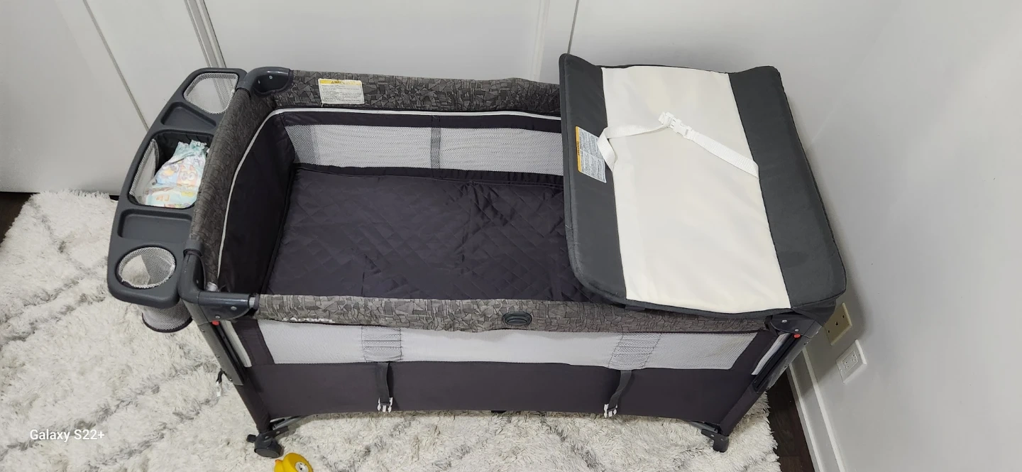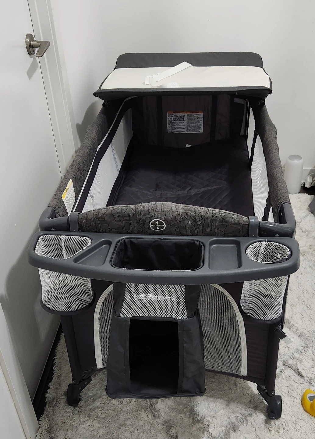 Selling a gently used ADOVVEL baby playard. It comes with a convenient changer attachment, making diaper changes a breeze. The playard is in great condition and perfect for newborns and toddlers. It's a safe and comfortable space for your little one to play and sleep! It has a tiny crack if you look further in the pictures.