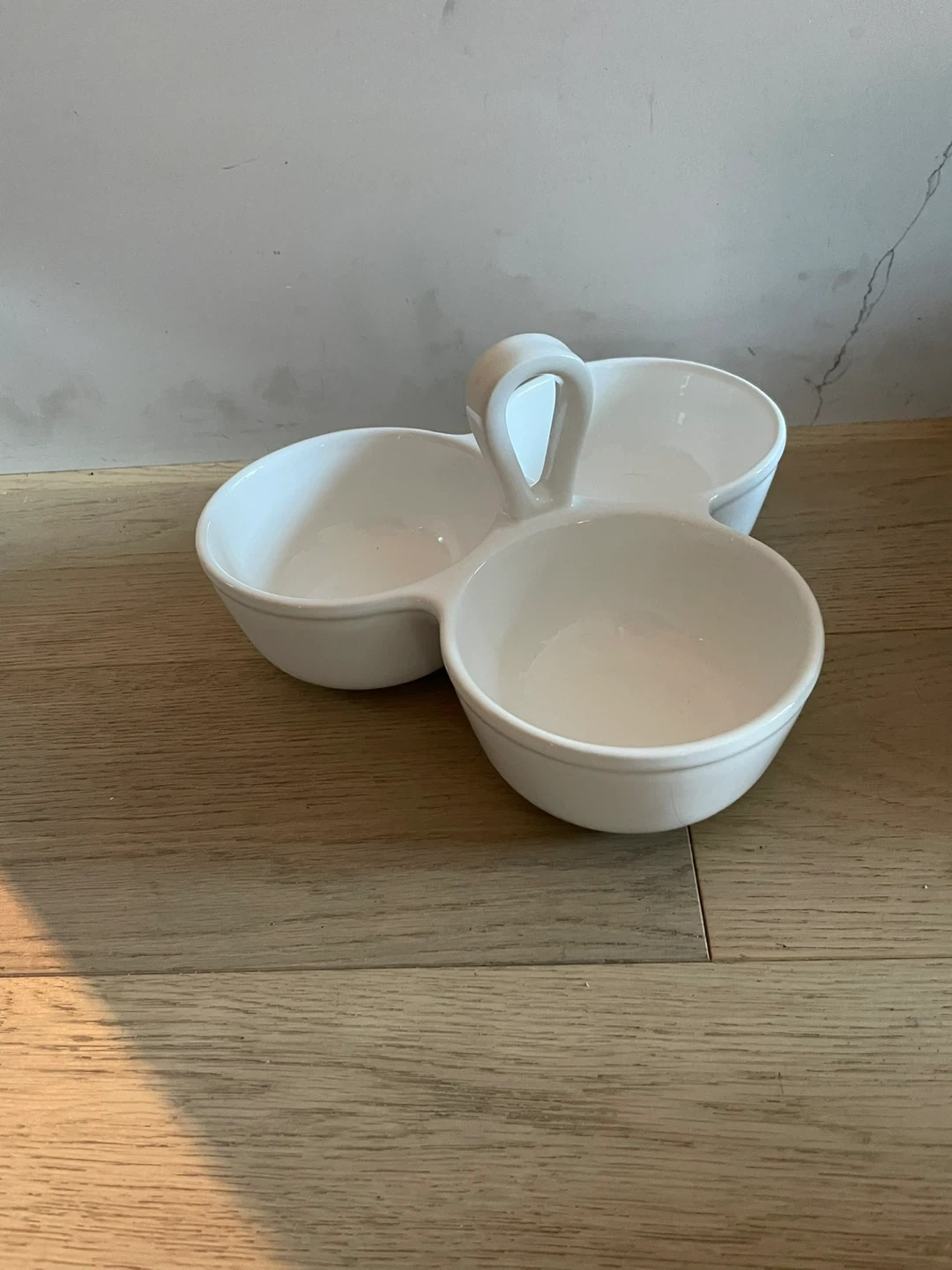 White ceramic serving tray with three compartments. It has a central handle for easy carrying. This tray is perfect for serving snacks, appetizers, or dips at gatherings.