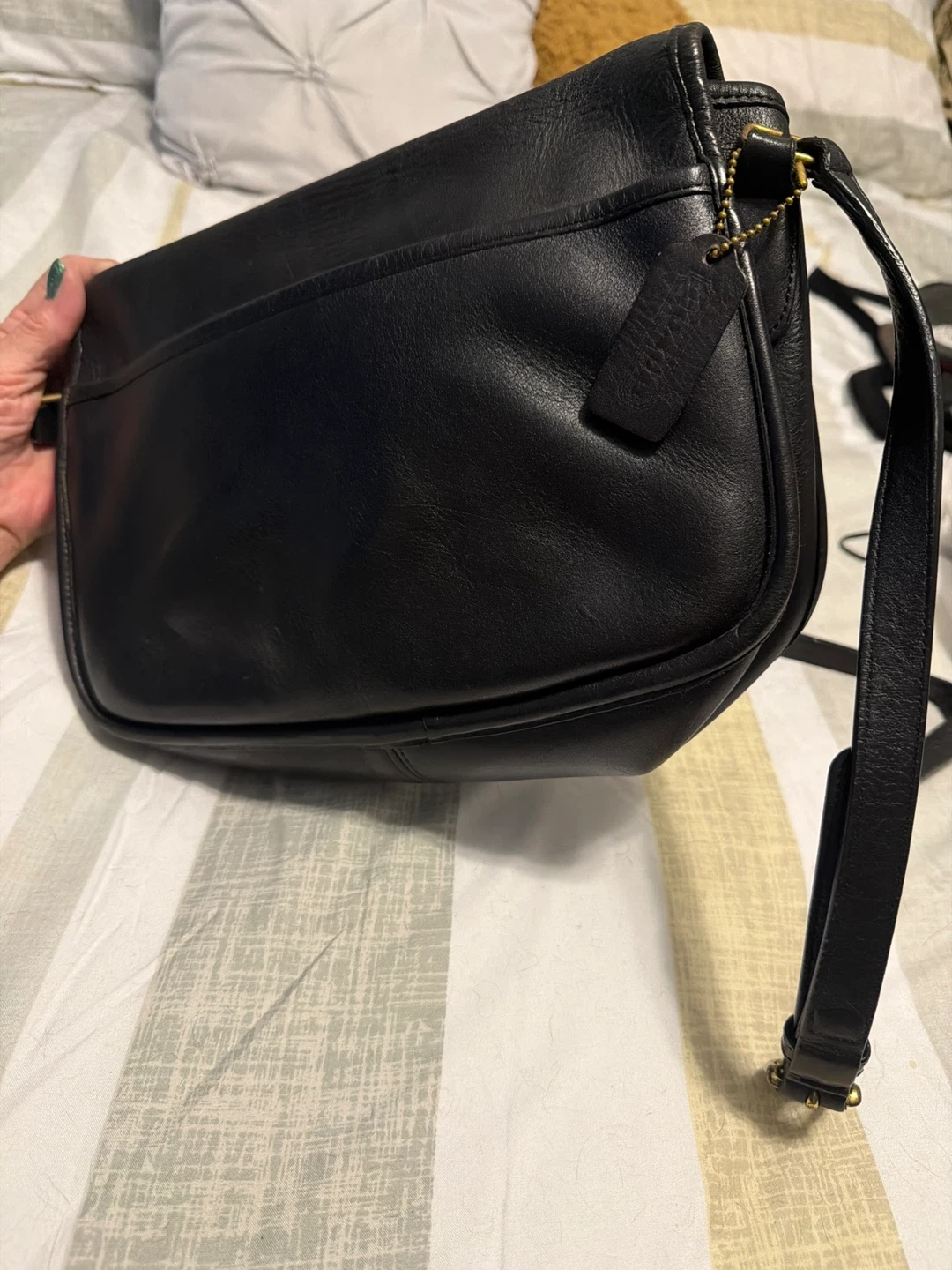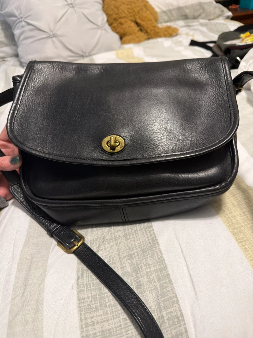 Classic black leather shoulder bag from Coach. It's made of genuine leather with a brass clasp closure. Includes adjustable strap and interior zip pocket.