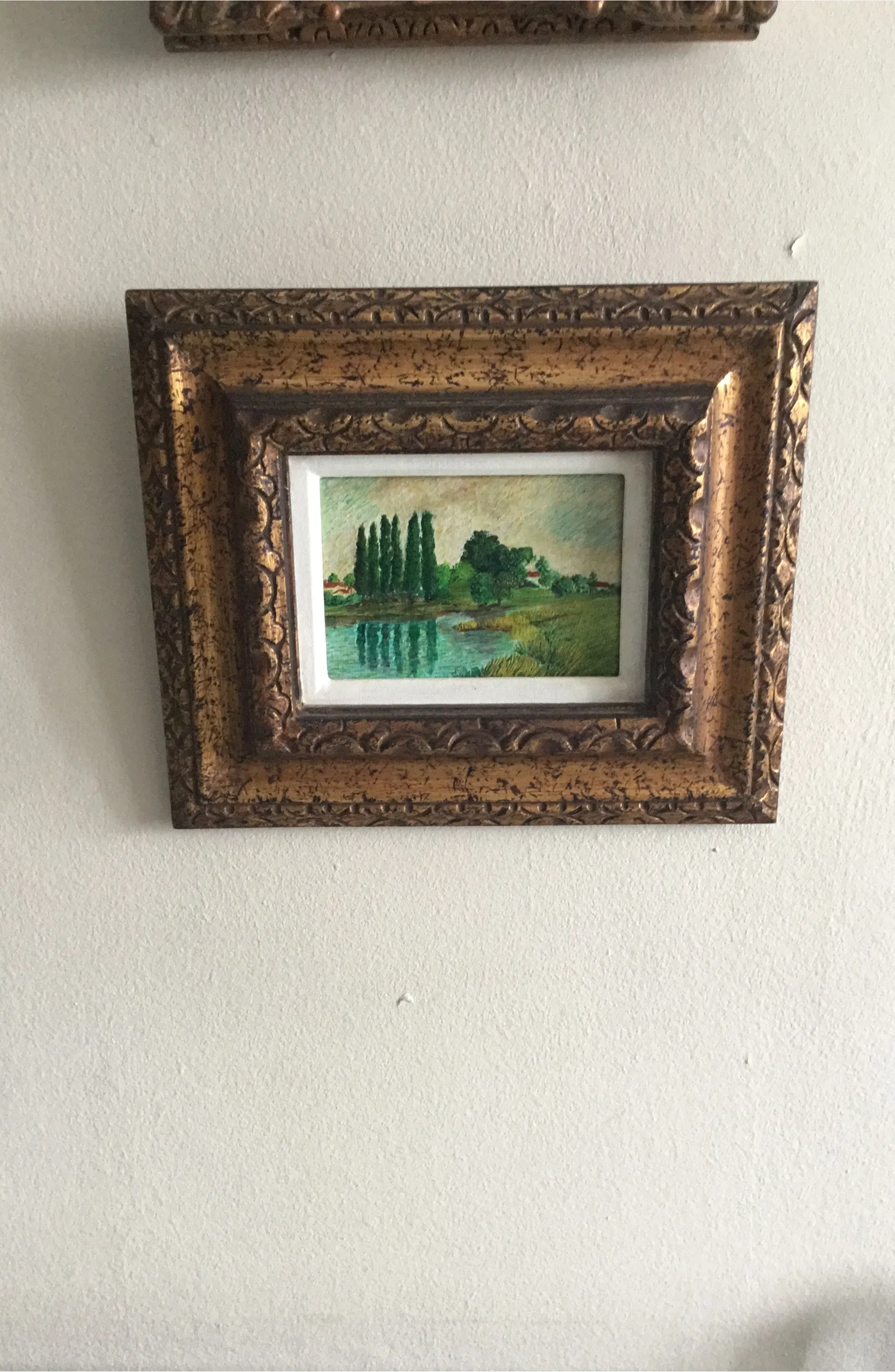 This is a small, framed painting depicting a serene landscape. It features tall green trees reflected in a calm body of water, with hints of houses in the background. The frame is ornate and gold-toned. This piece would add a touch of nature to any wall!