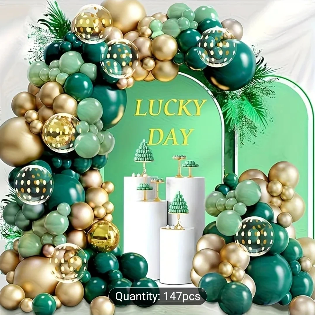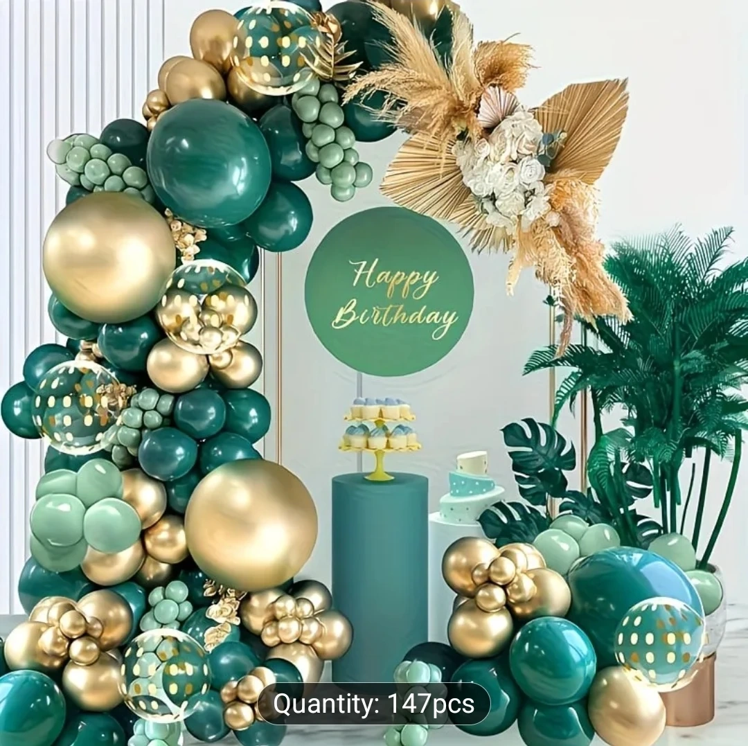 This balloon kit includes 147 pieces in various sizes and colours: dark green, light green, and gold. It also comes with a ribbon, glue dots, and a balloon arch strip for assembly. Perfect for creating a festive backdrop for celebrations!