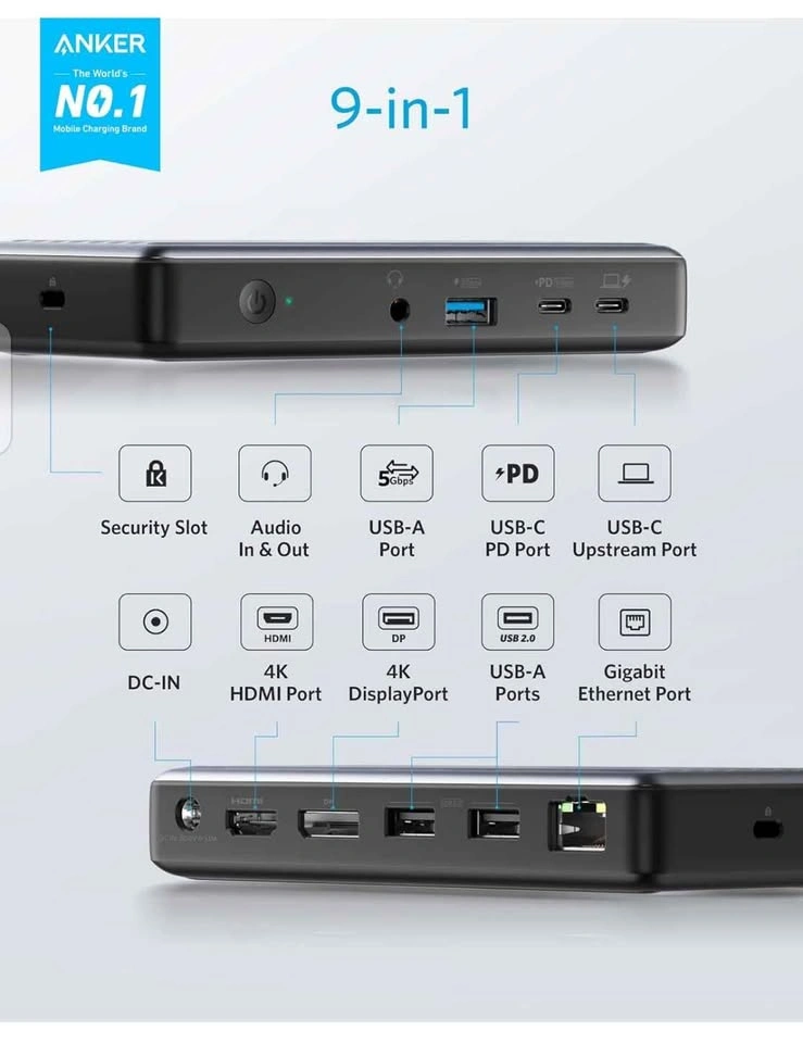 Anker USB C Docking Station, PowerExpand 9-in-1 PD Dock, 60W Charging for Laptop, 20W Power Delivery, 4K HDMI and DisplayPort, USB 3.0 and USB 2.0 Data, Gigabit Ethernet, 3.5 mm Audio. To pick up Queens NY. Open Box