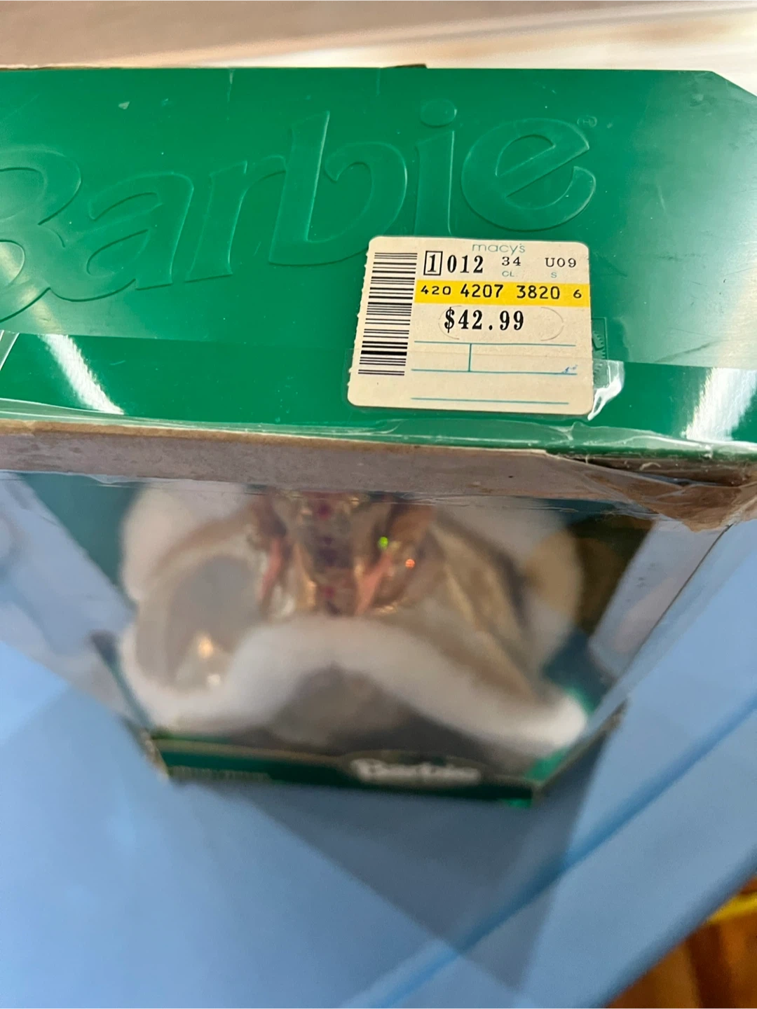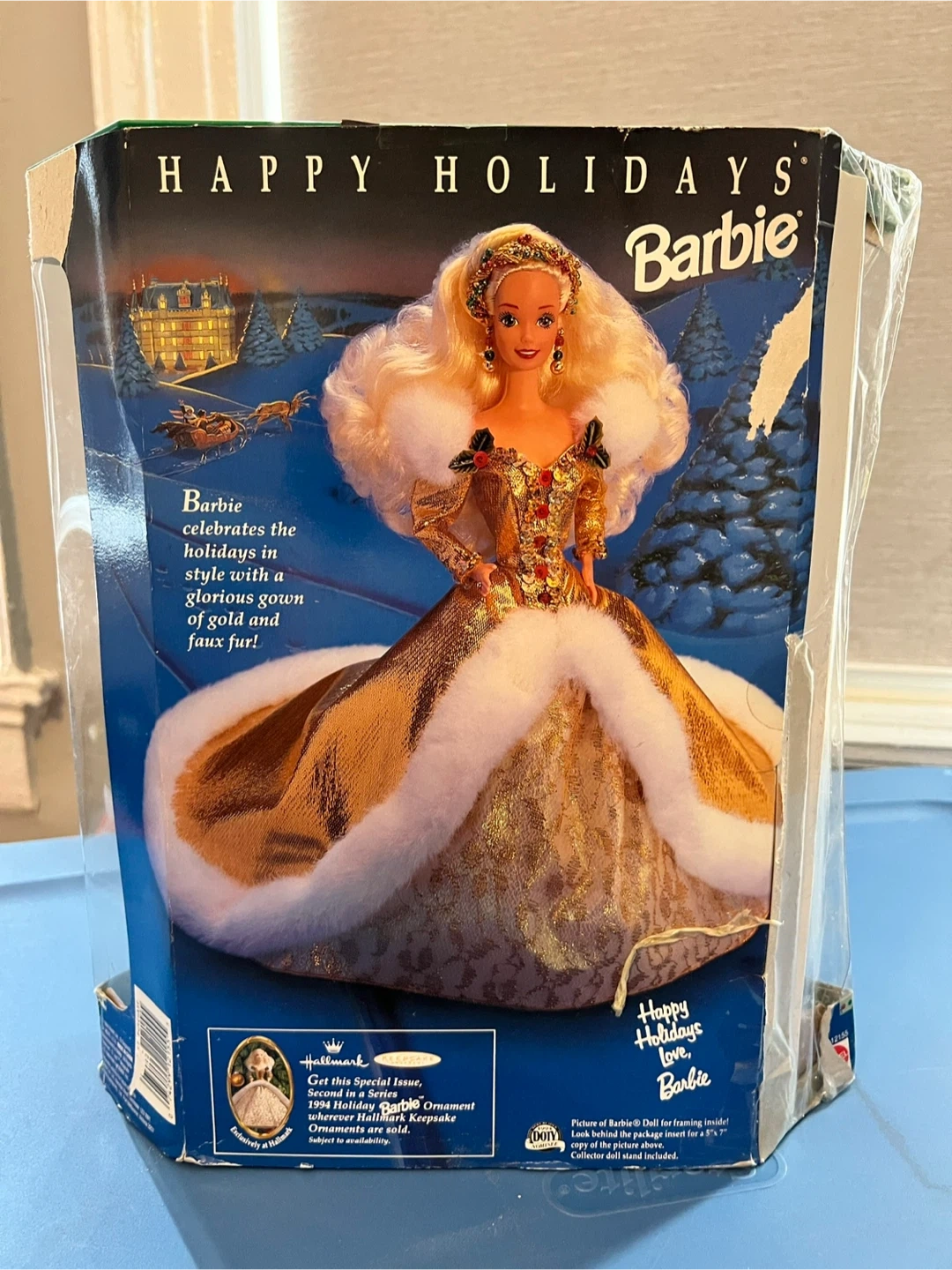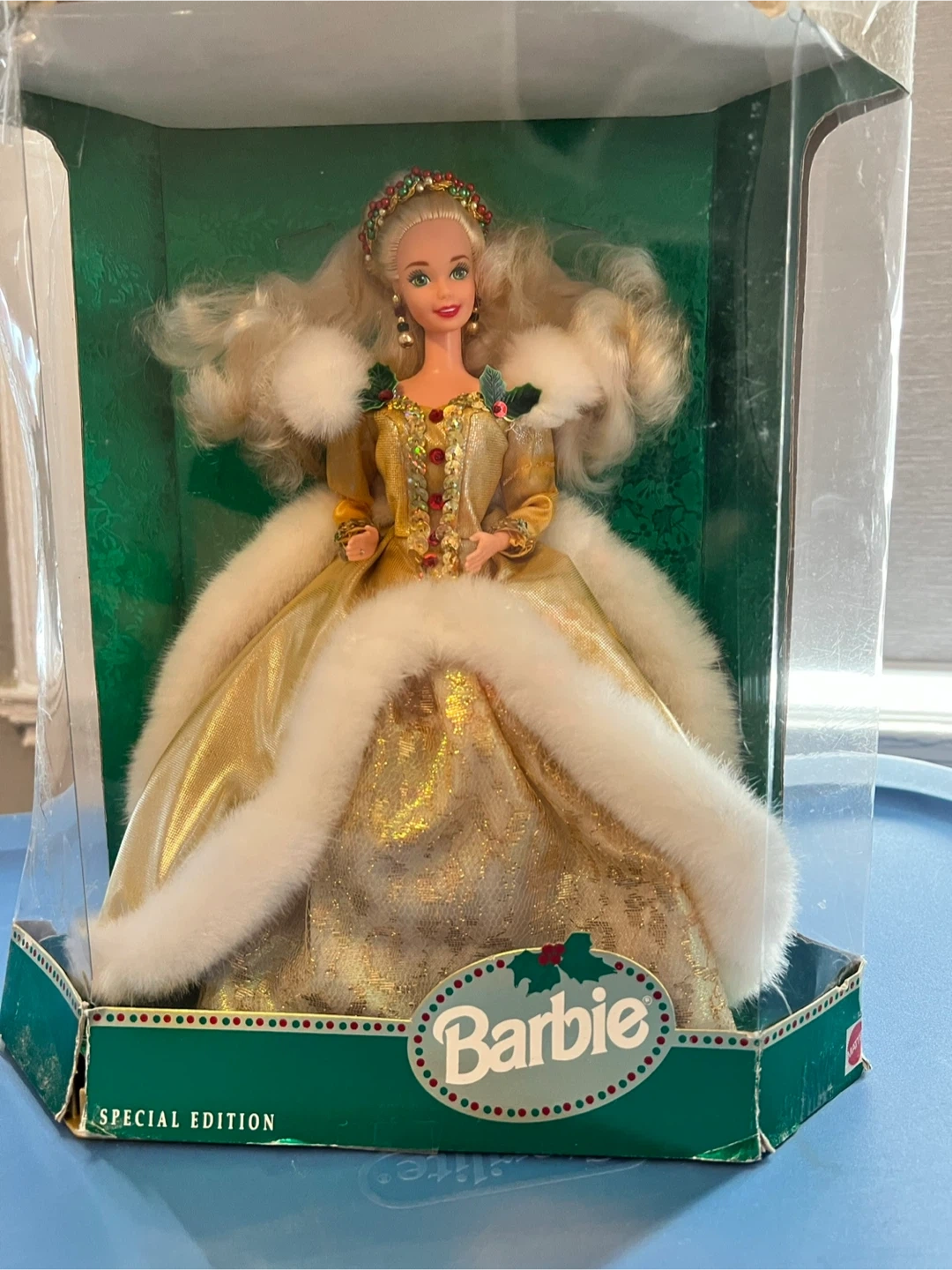 This Happy Holidays Barbie is a special edition doll. It's dressed in a glorious gown of gold and faux fur, celebrating the holidays in style. Comes in its original box.