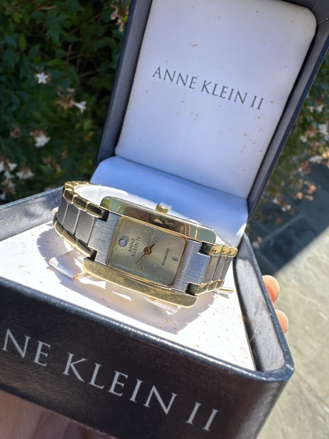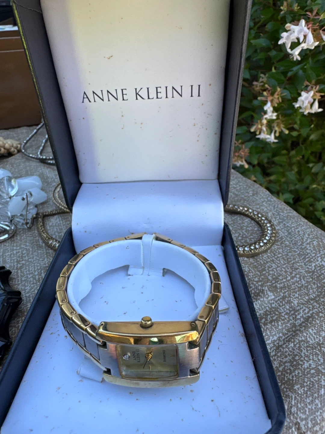Selling an Anne Klein II women's watch. It comes with its original box. The watch has a gold and silver band and a rectangular face. It's in great condition and ready for a new owner