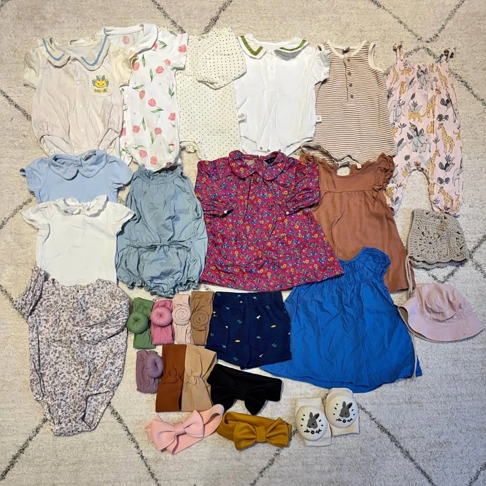 Adorable bundle of baby girl clothing and accessories, size 6-12 months. Includes a mix of bodysuits, bloomers, and headbands in soft, neutral, and floral tones. Gently used, in great condition with no stains or damage. Soft, comfortable fabrics perfect for everyday wear or photos. Comes with multiple outfits and matching accessories – super cute and practical! Pet-free & smoke-free home. Pick-up in Port Coquitlam anytime or near Columbia Station on weekdays.