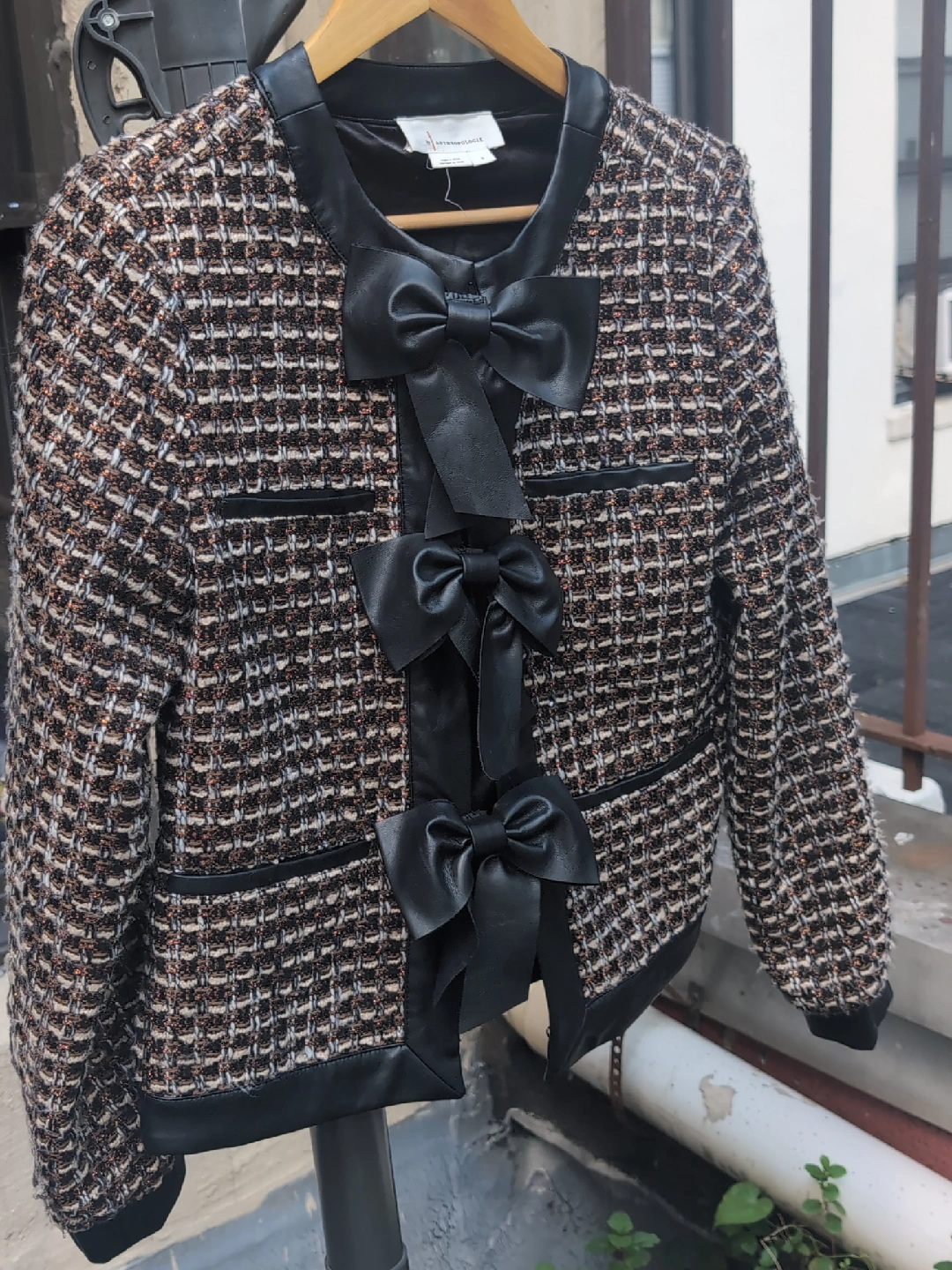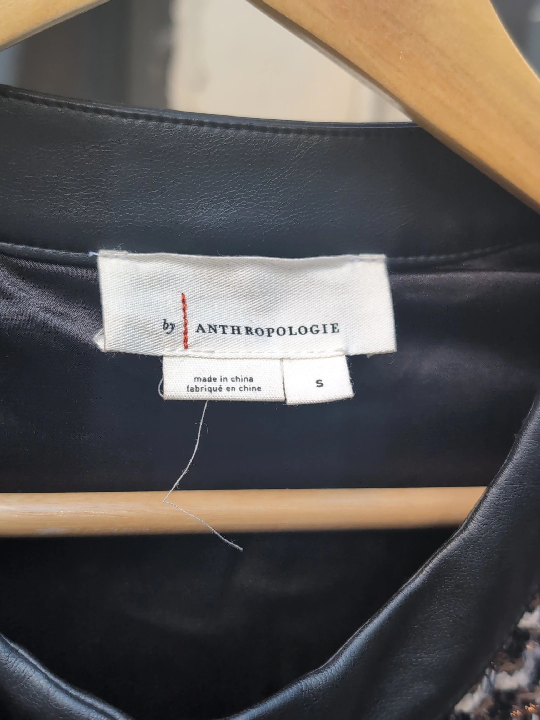 Selling a cute Anthropologie tweed jacket! It features a unique design with black bows down the front and faux leather trim. The size is S.