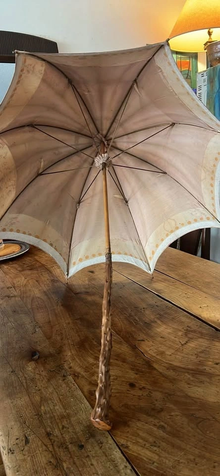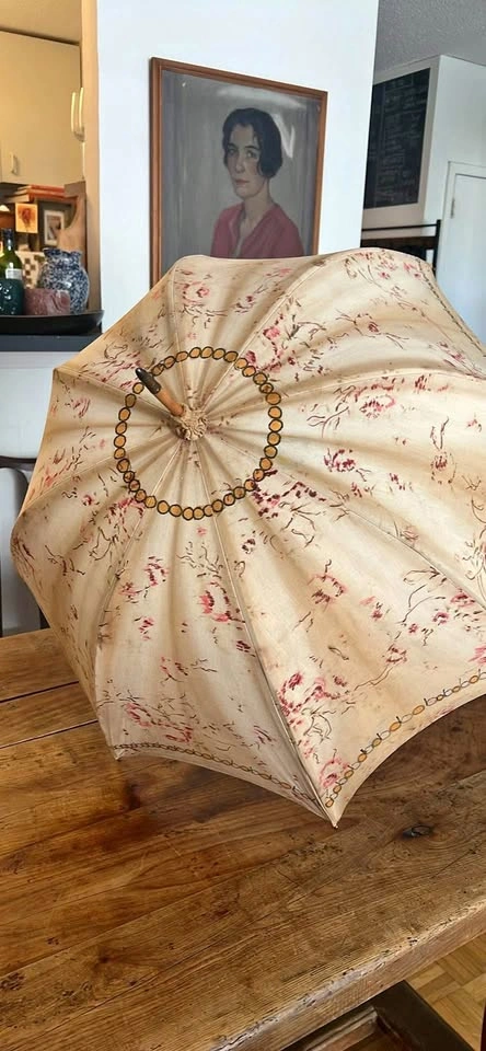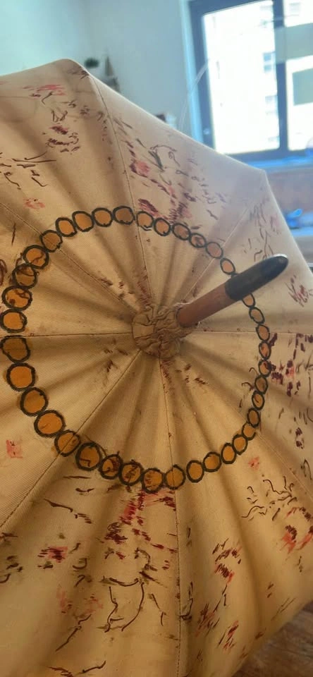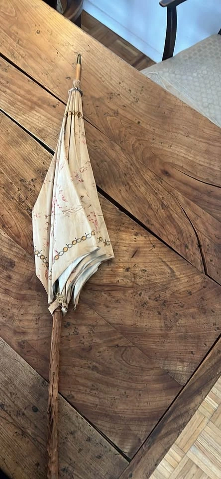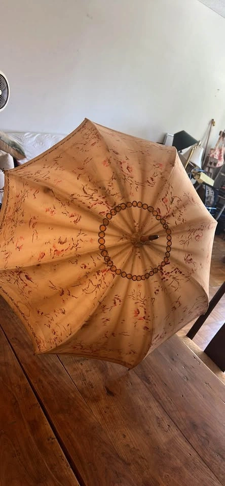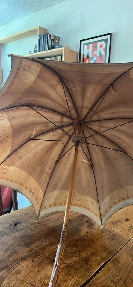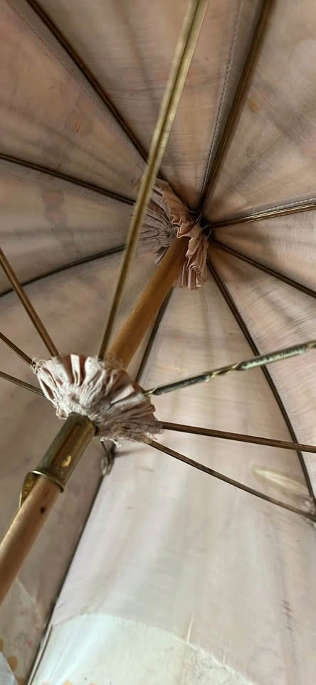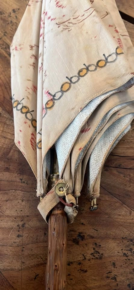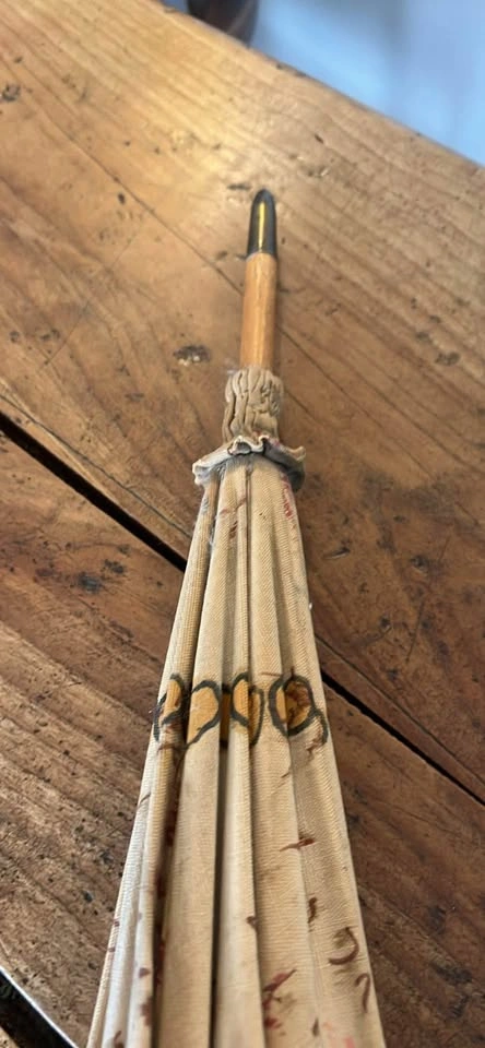 Antique Parasol/Umbrella. Cotton and Wood Parasol. Functioning but has some age stains.