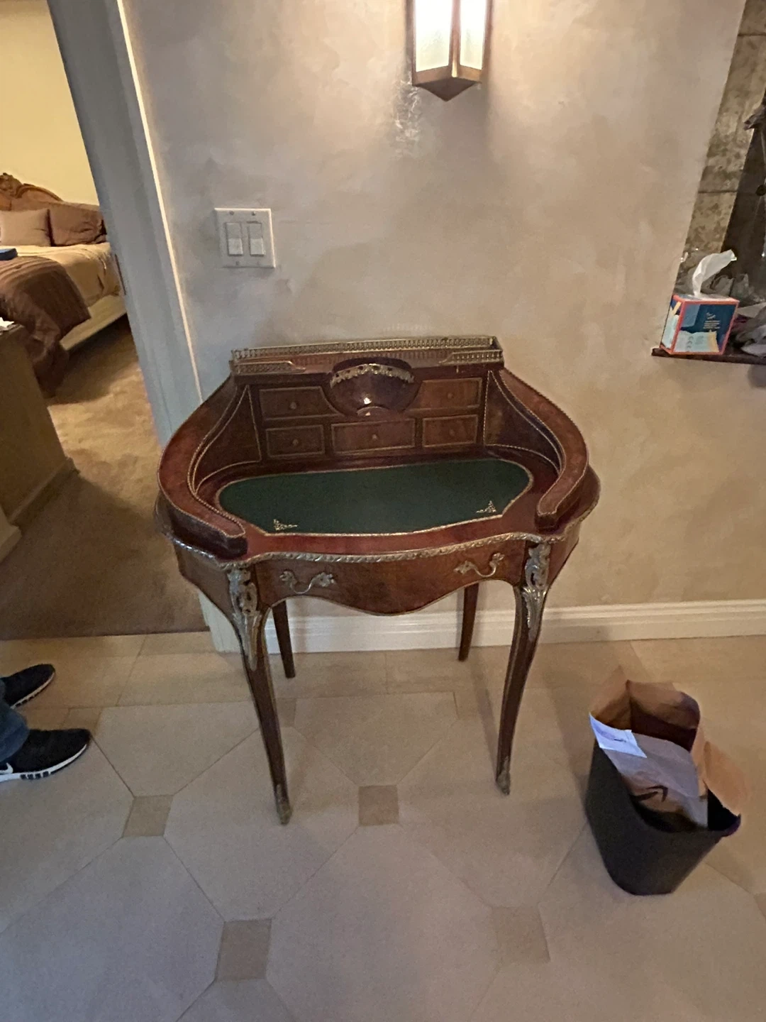 Louis XV Kingwood and Ormolu Lady's Desk Selling a beautiful antique-style vanity desk. It features a unique design with intricate detailing and a rich, warm wood finish. The desk has a green writing surface and multiple small drawers, perfect for storing your essentials. It's a lovely piece that would add character to any room