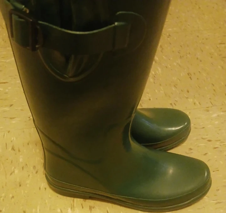 great condition These are green tall rain boots. They have a buckle accent on the side. Material is rubber.