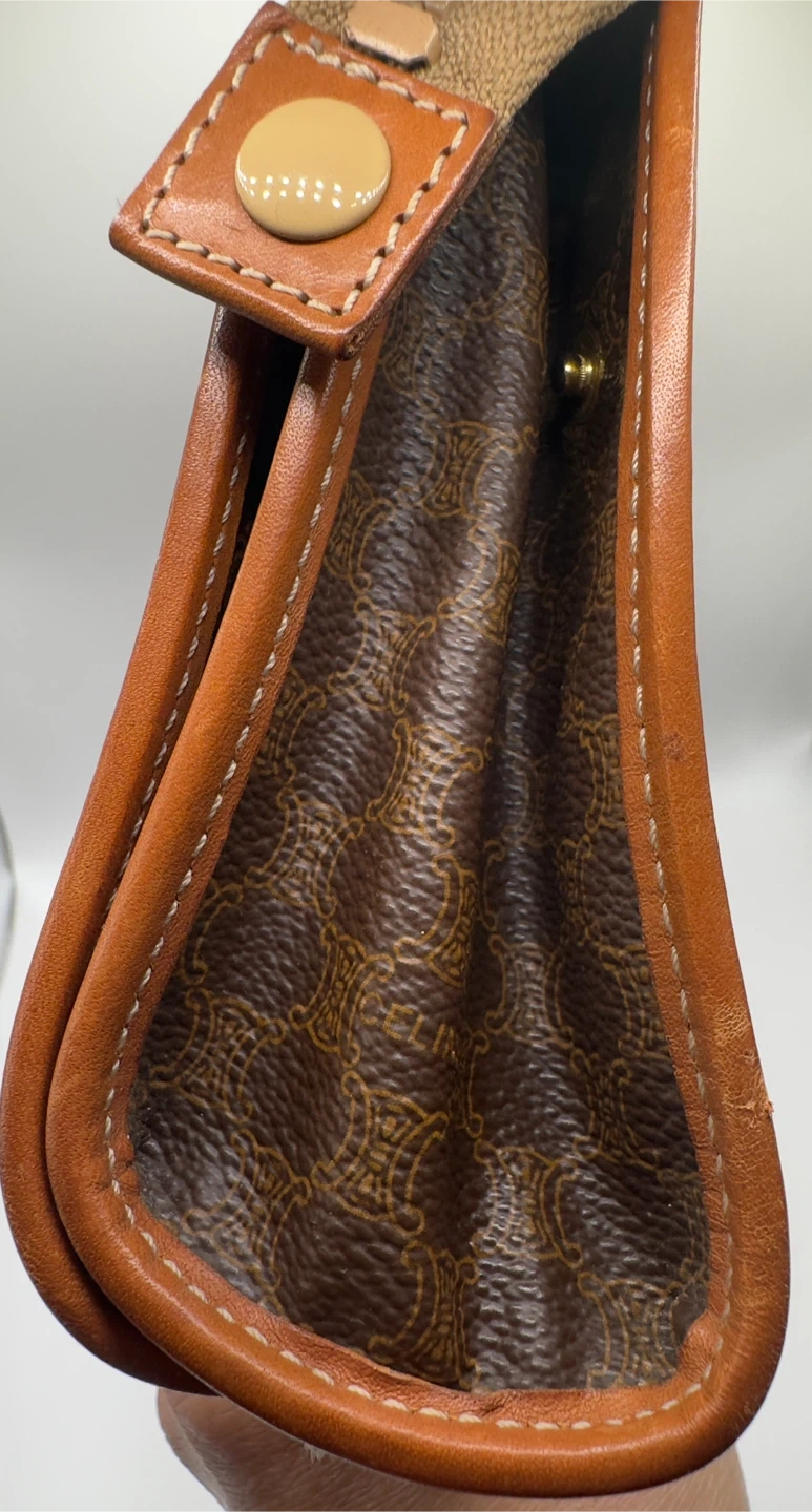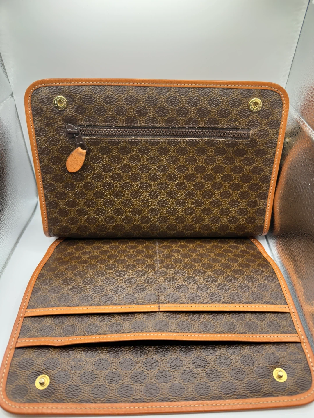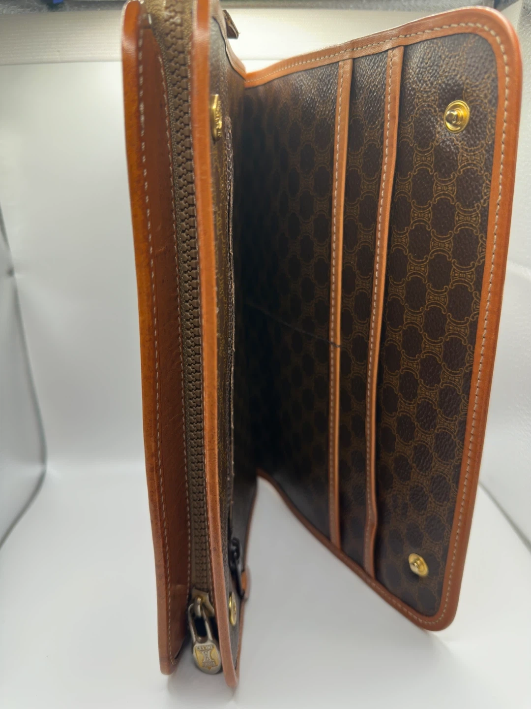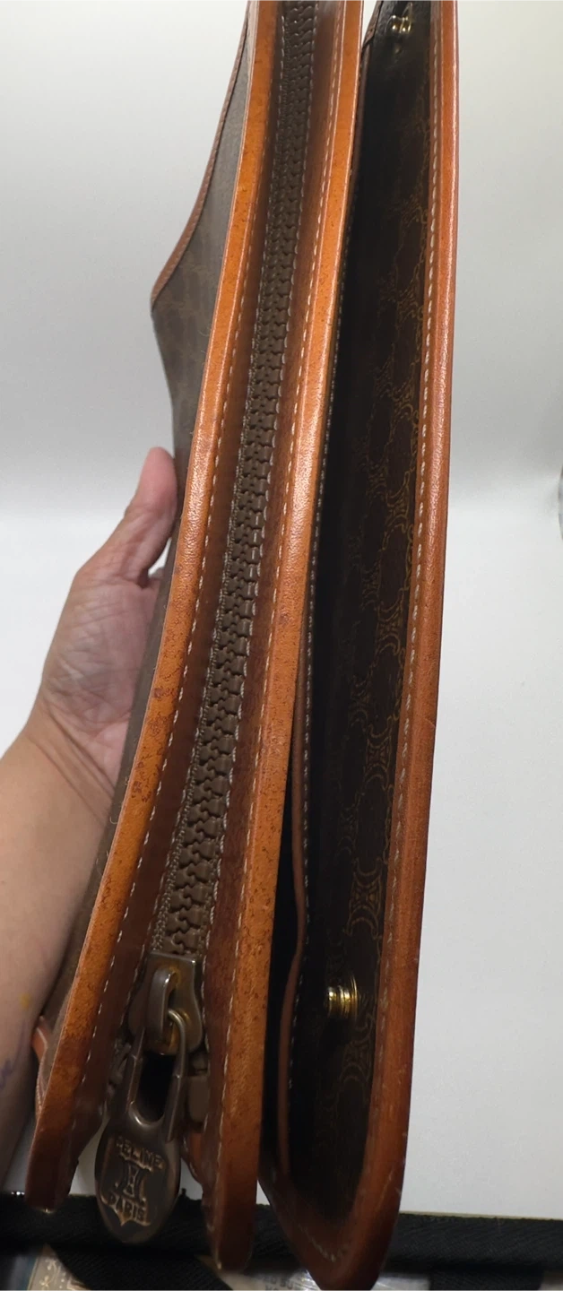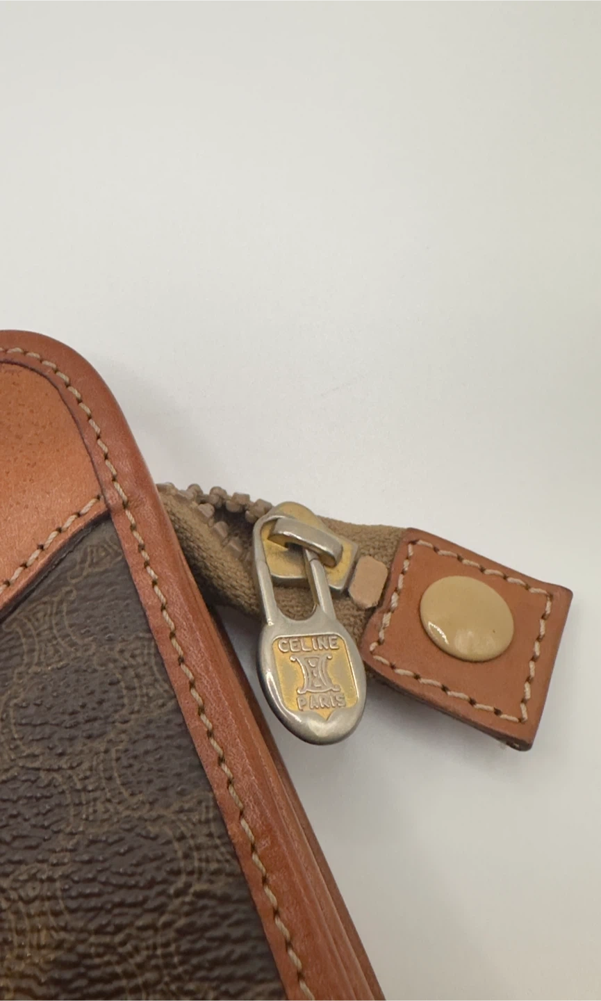A classic Celine clutch wallet featuring the signature monogram pattern. It's made with brown canvas and tan leather trim. Multiple card slots and a zippered compartment inside.