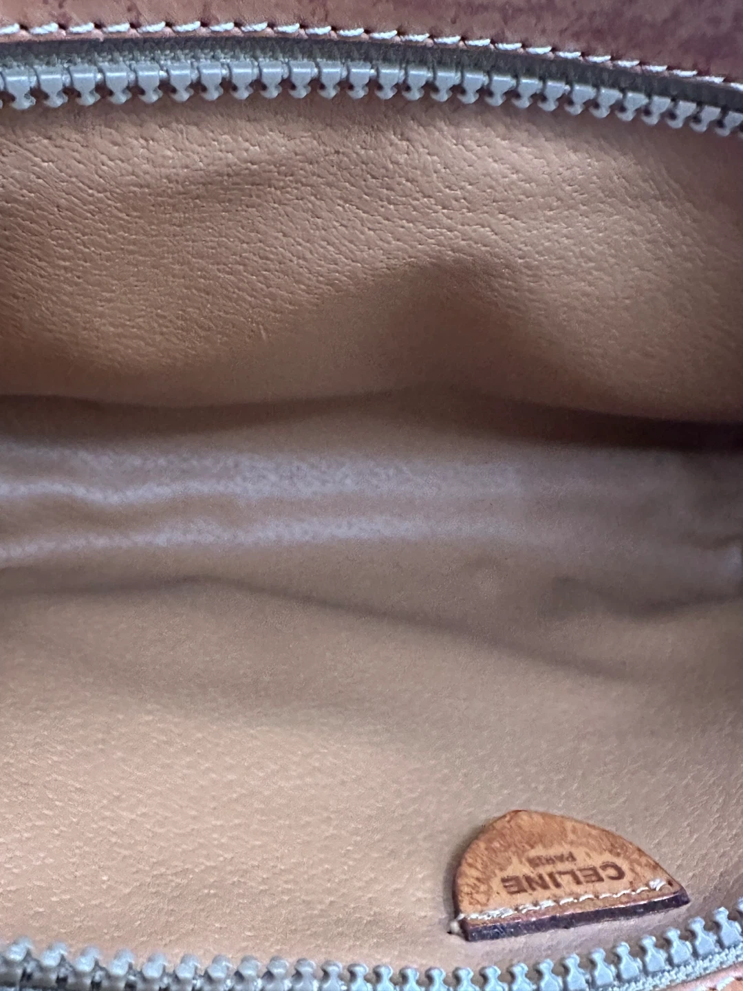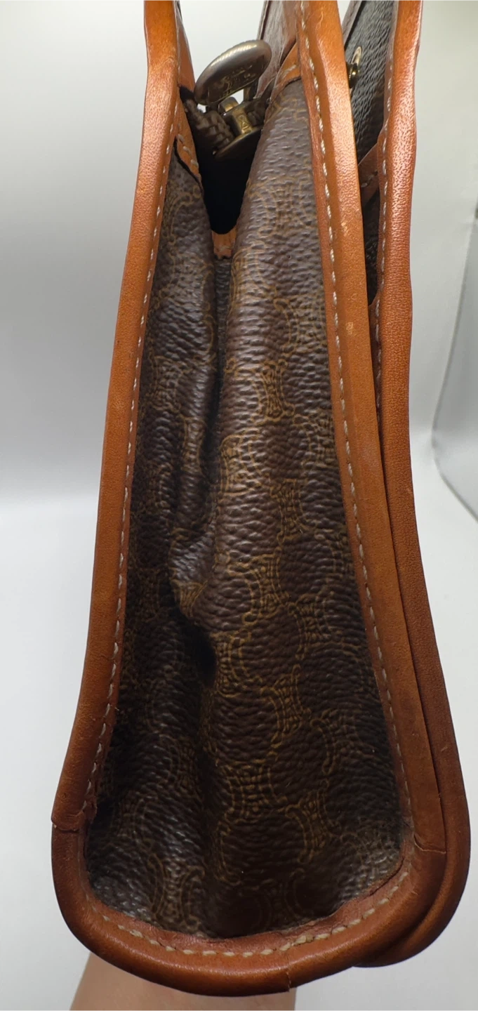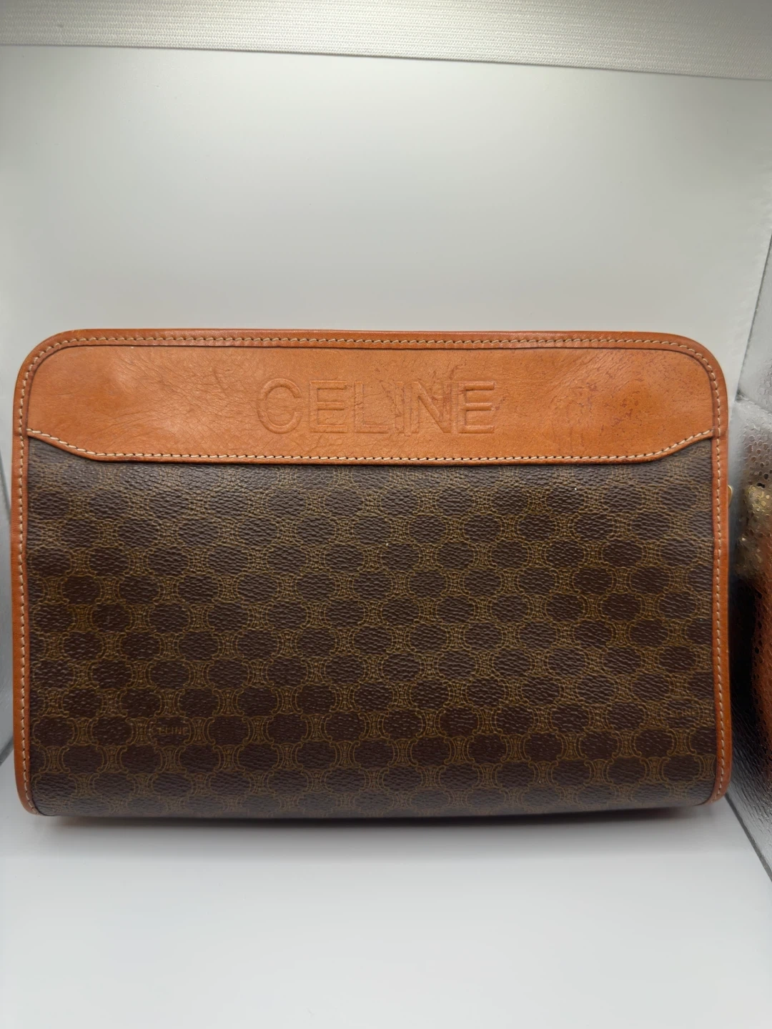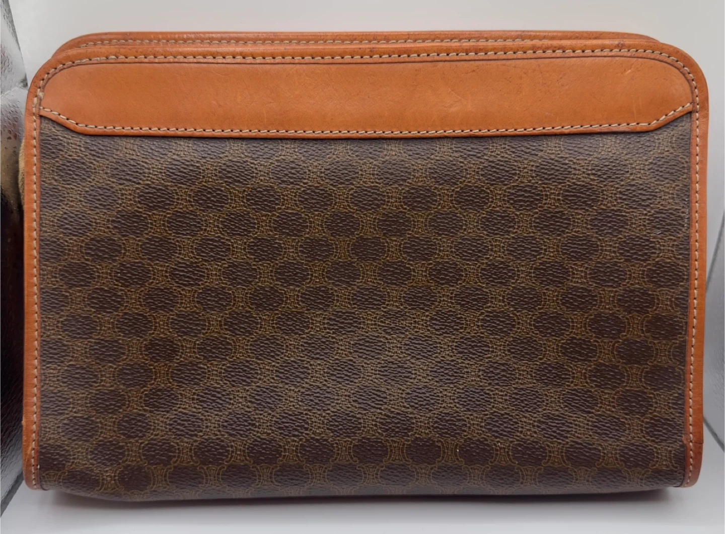 A classic Celine clutch wallet featuring the signature monogram pattern. It's made with brown canvas and tan leather trim. Multiple card slots and a zippered compartment inside.
