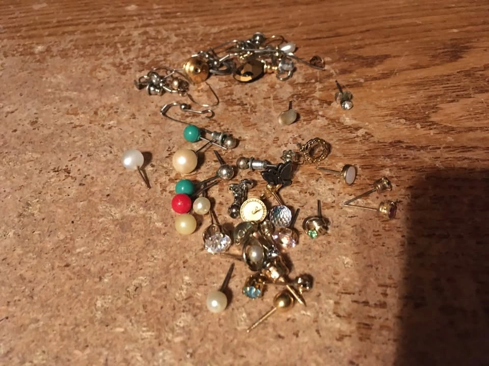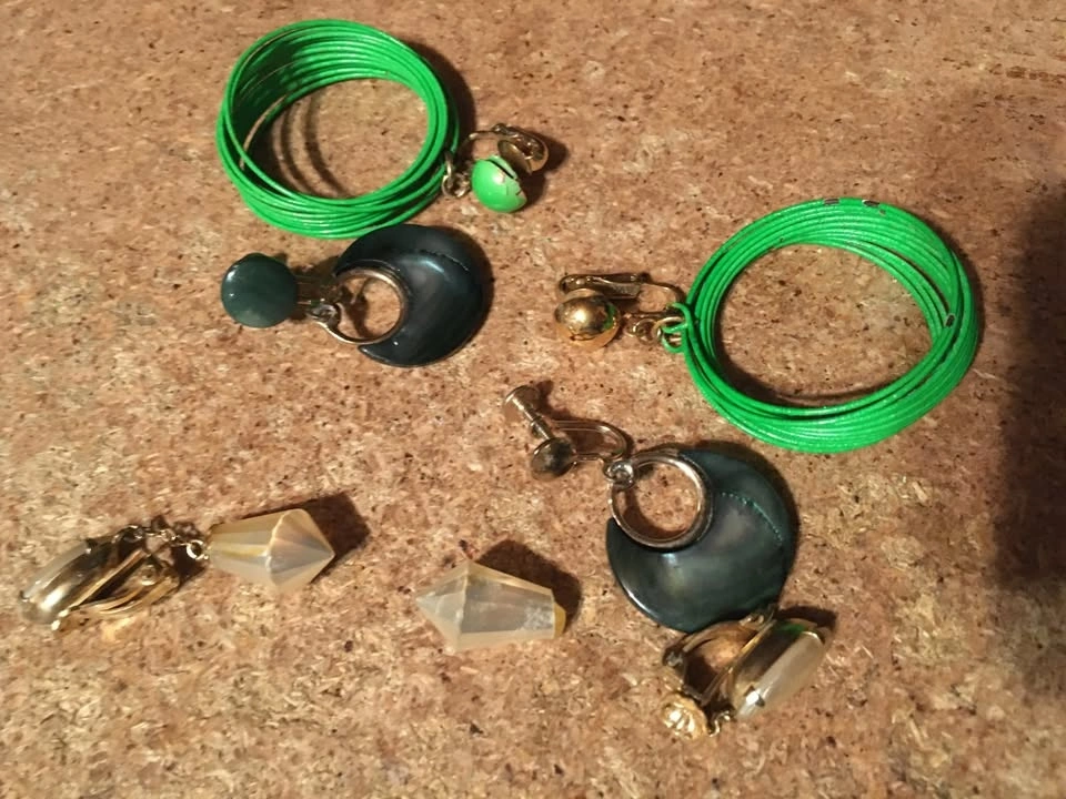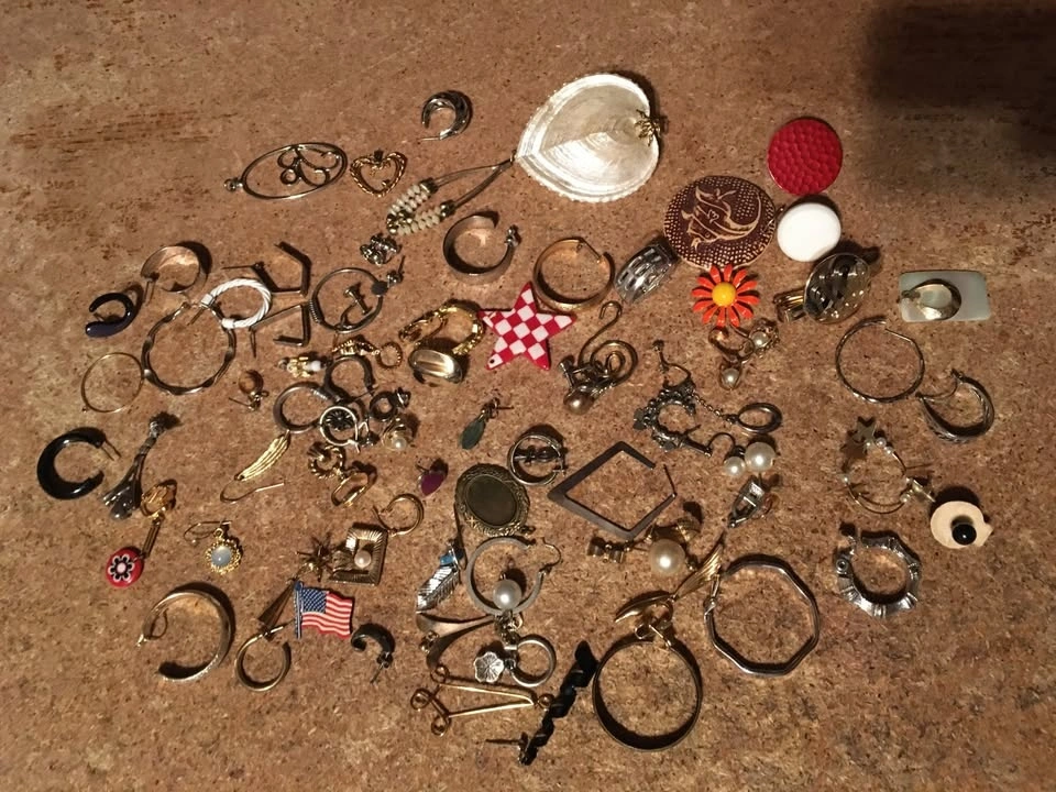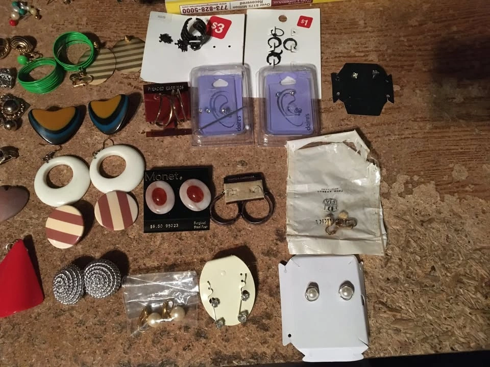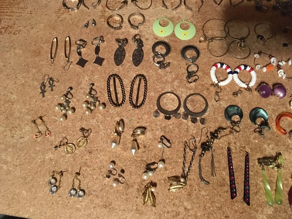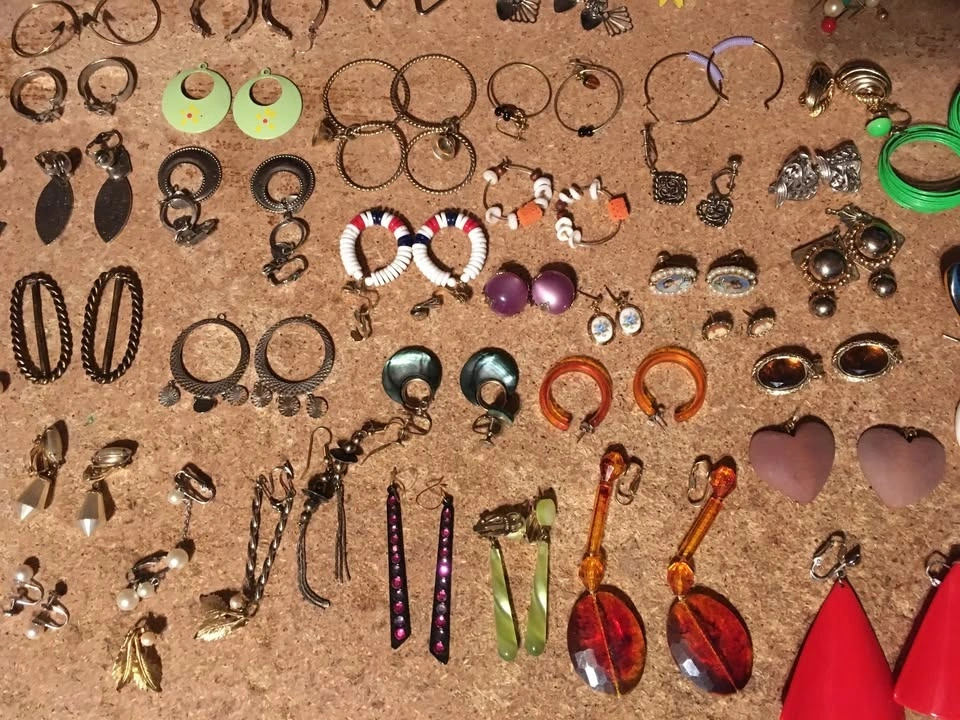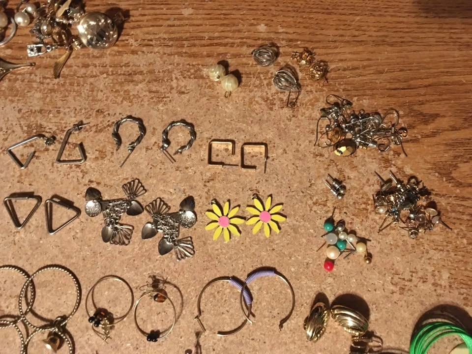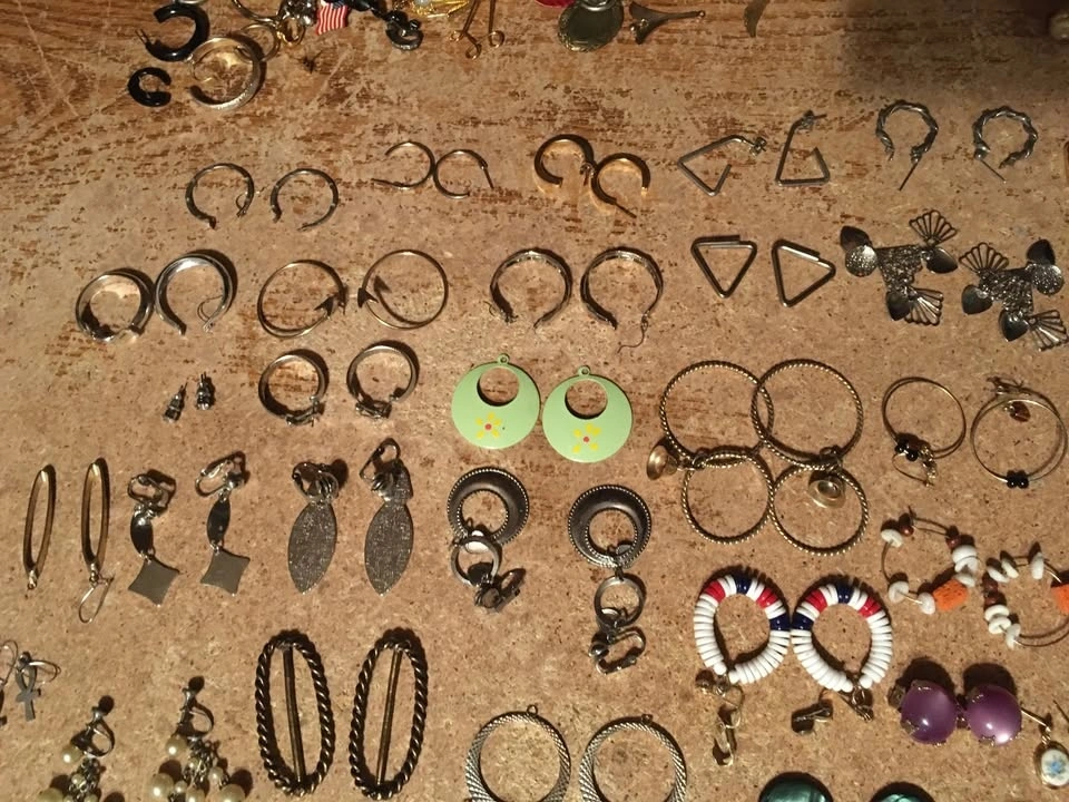 Random lot of jewelry, approximately 70 pairs of earrings. Most are in good condition, some appear unused. Please note that not all pairs have their original backings. There are also about 80 single earrings, including some small gem singles, as shown in pictures 8 and 9. Some specific pairs have noted issues: the green circle pair is missing its mate, one green hoop earring has a backing that has rubbed off, and another earring has had its hanging part come off. These specific issues are all visible in the last picture. Most earrings are for pierced ears, but some are clip-on. This lot includes many single earrings with some hooks/backings provided, and a few items from brands like H&M and Claire's.