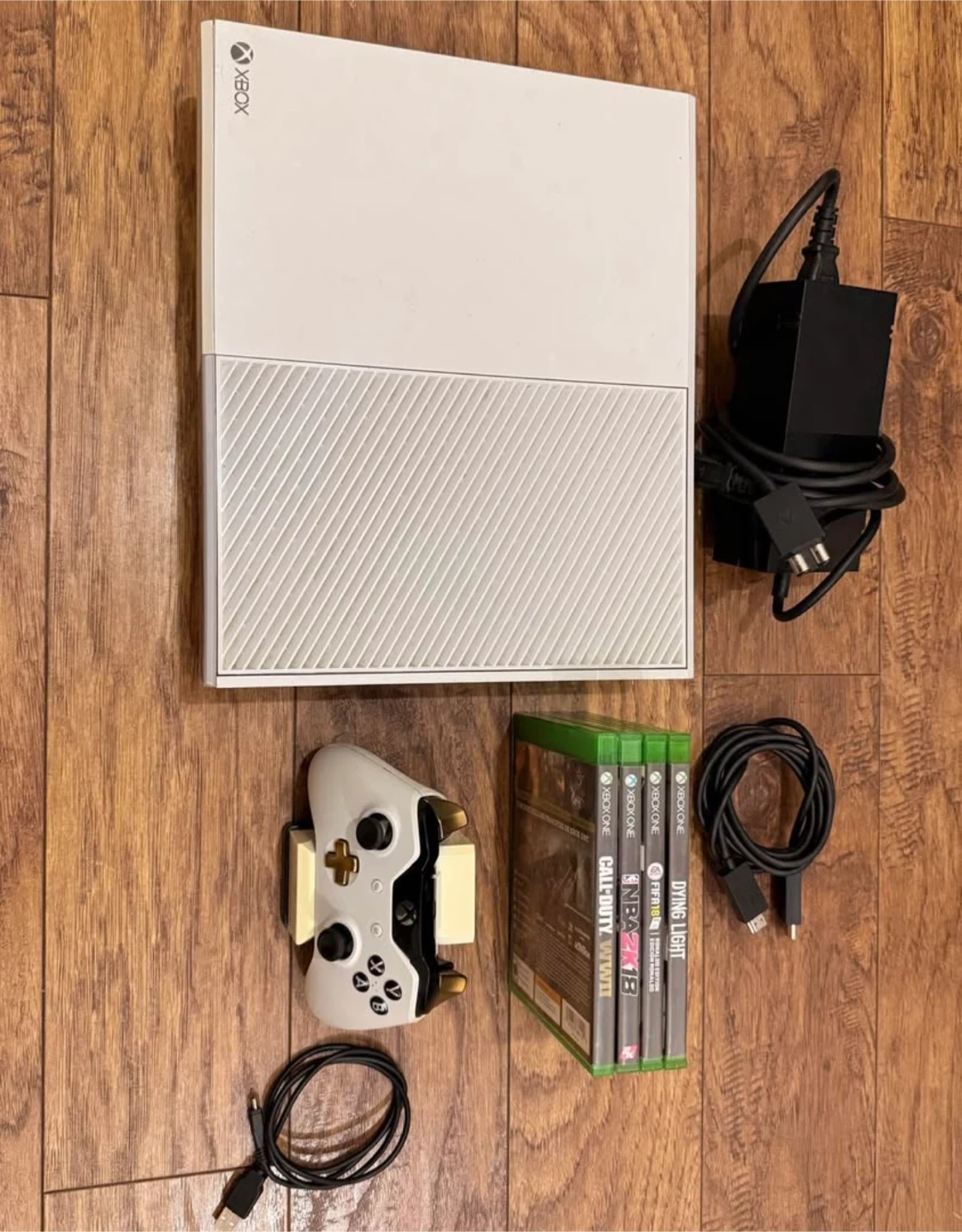 This bundle includes a white Xbox One S 500GB console, a white controller, power brick, HDMI cable, and a selection of games. It comes with Call of Duty: Advanced Warfare, Call of Duty: Ghosts, and Dying Light. Perfect for gaming enthusiasts!