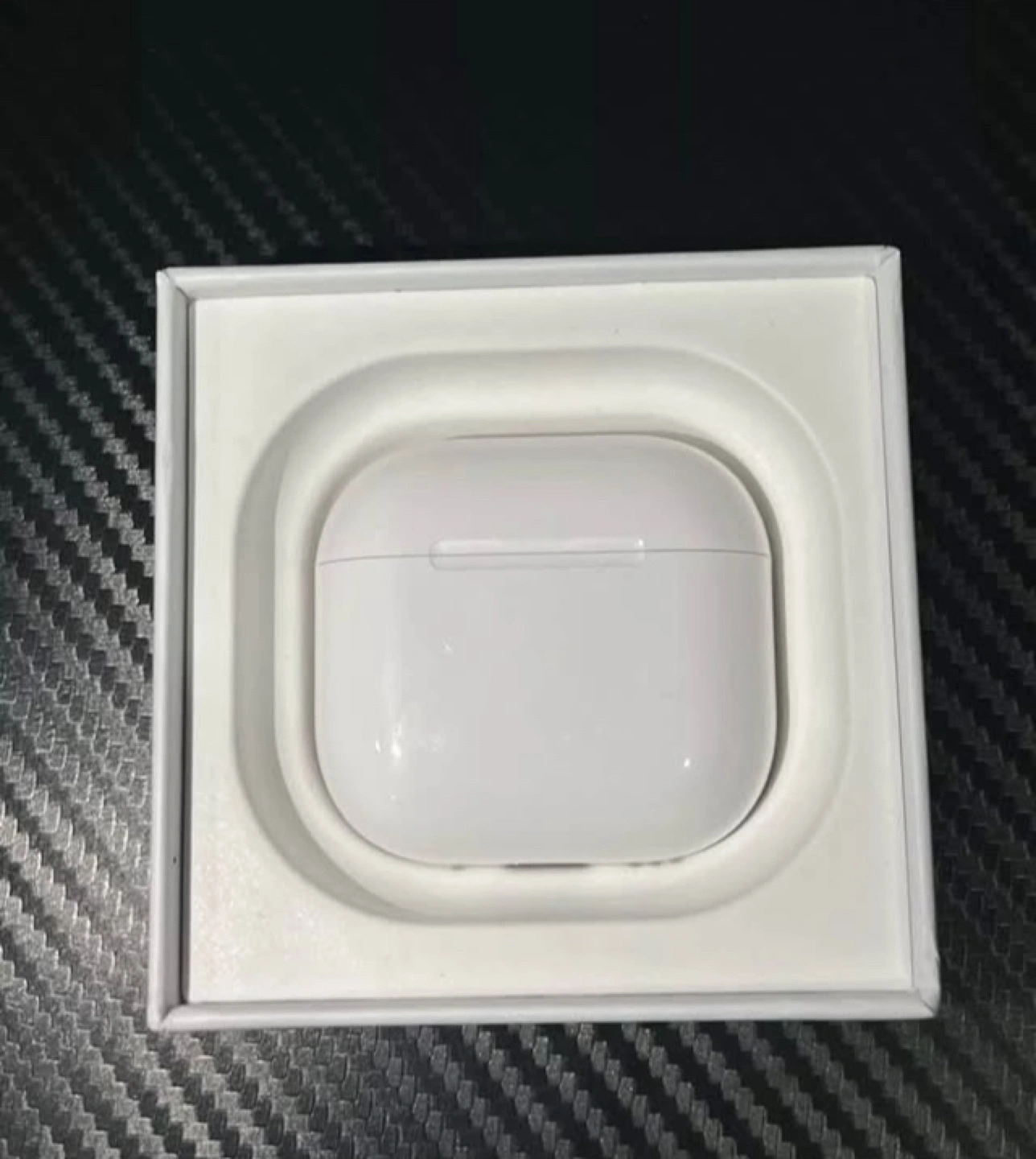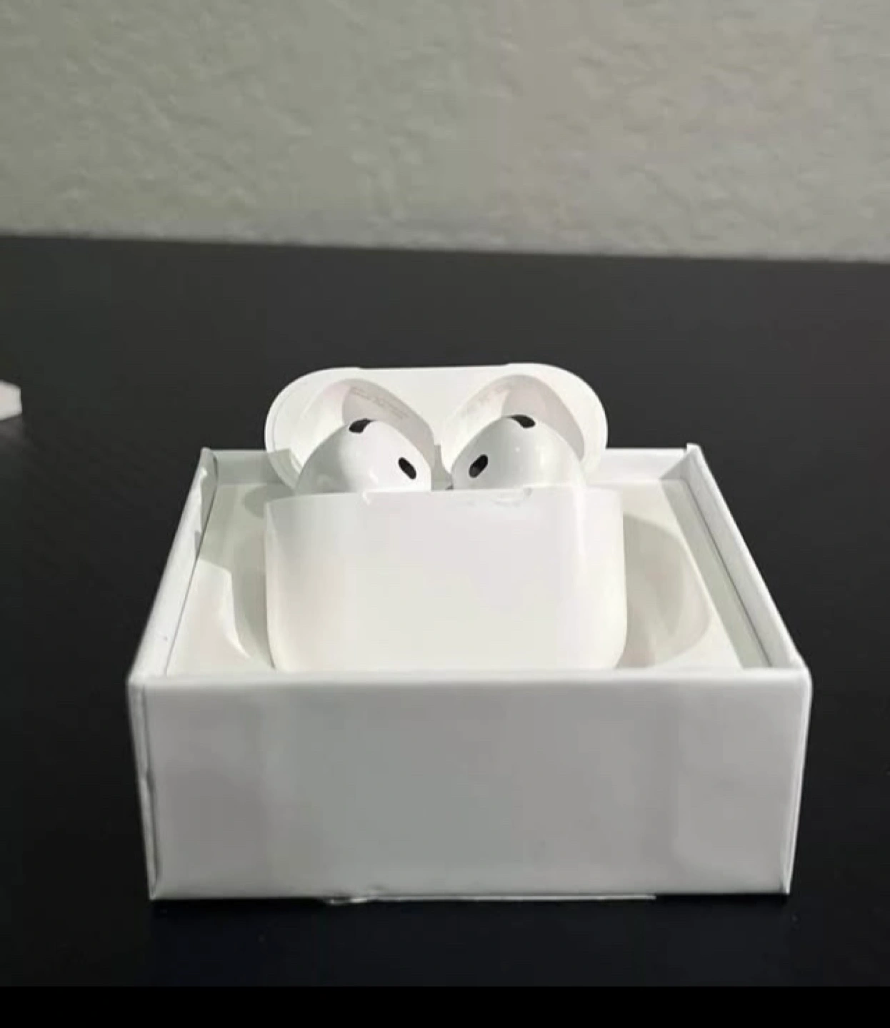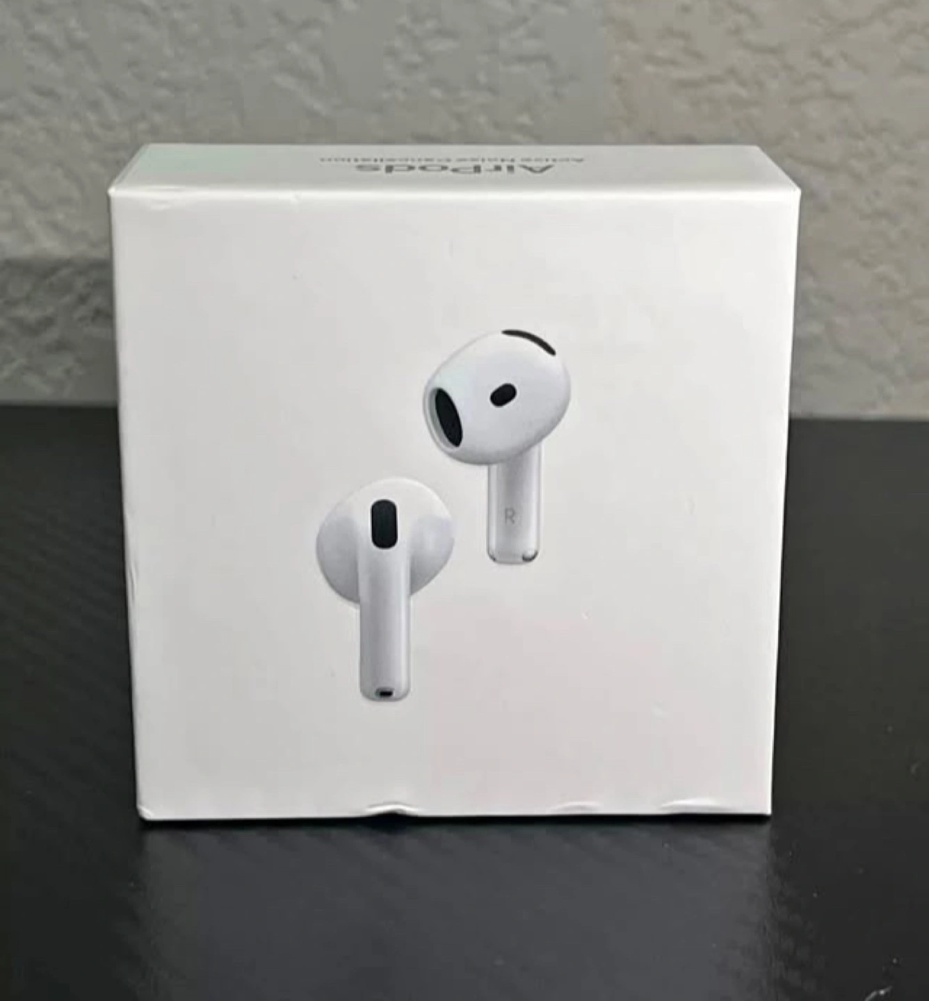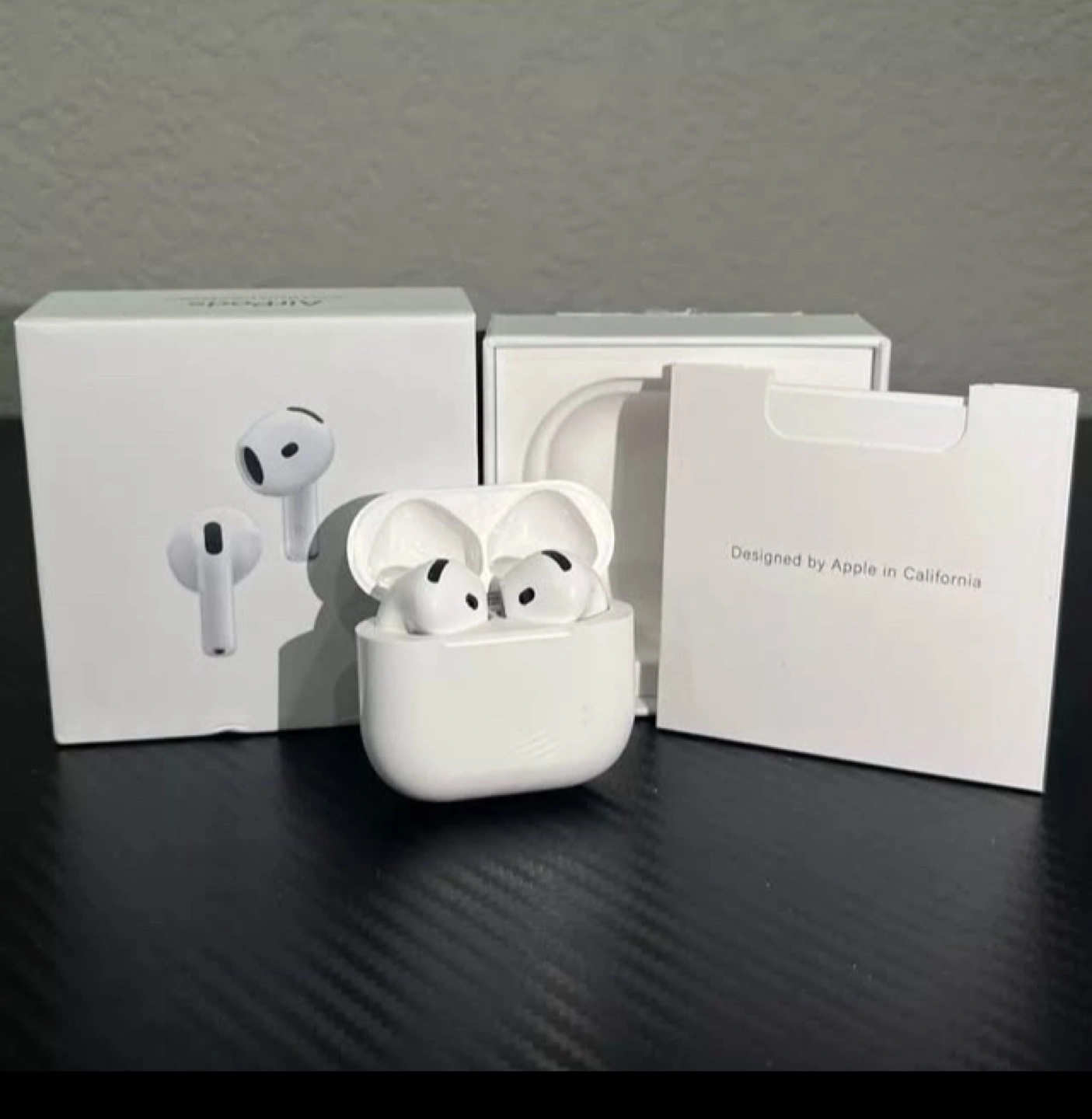Wireless earbuds, charging case included. New, unopened box. Designed by Apple in California.