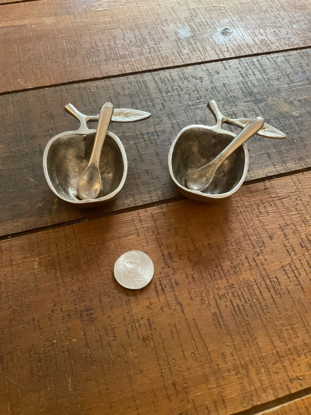 Here are two cute apple-shaped salt cellar bowls, each with its own little spoon! They're perfect for adding a touch of whimsy to your table setting or kitchen decor