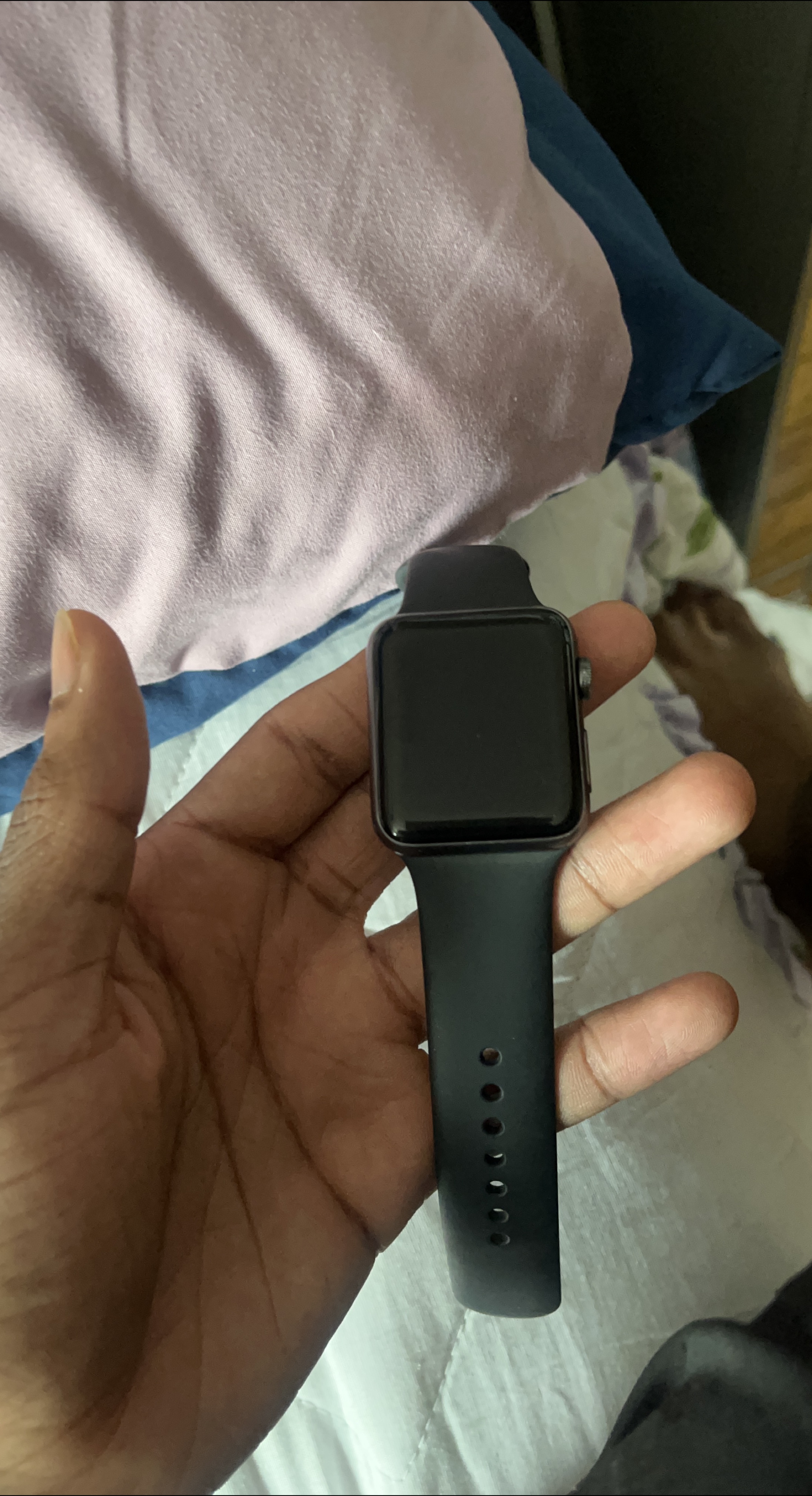 Selling a used Apple Watch with a black band. It's in good condition and ready for a new owner!