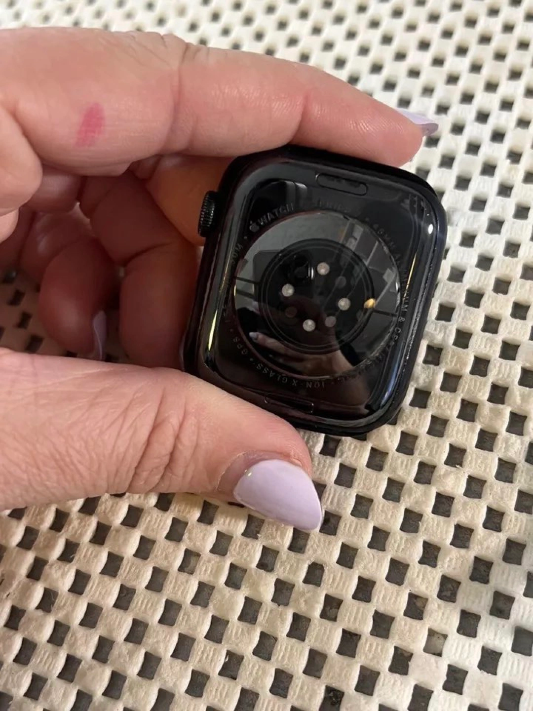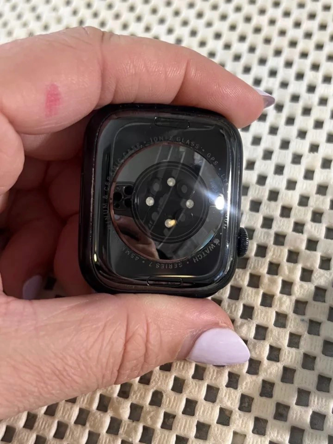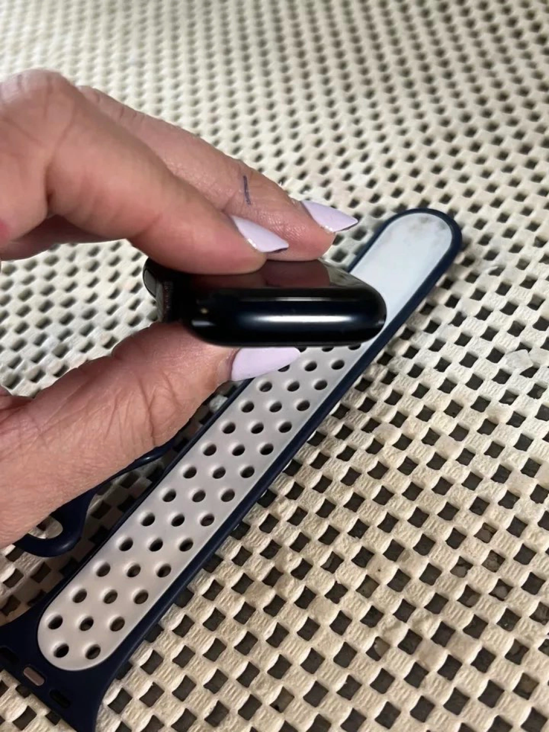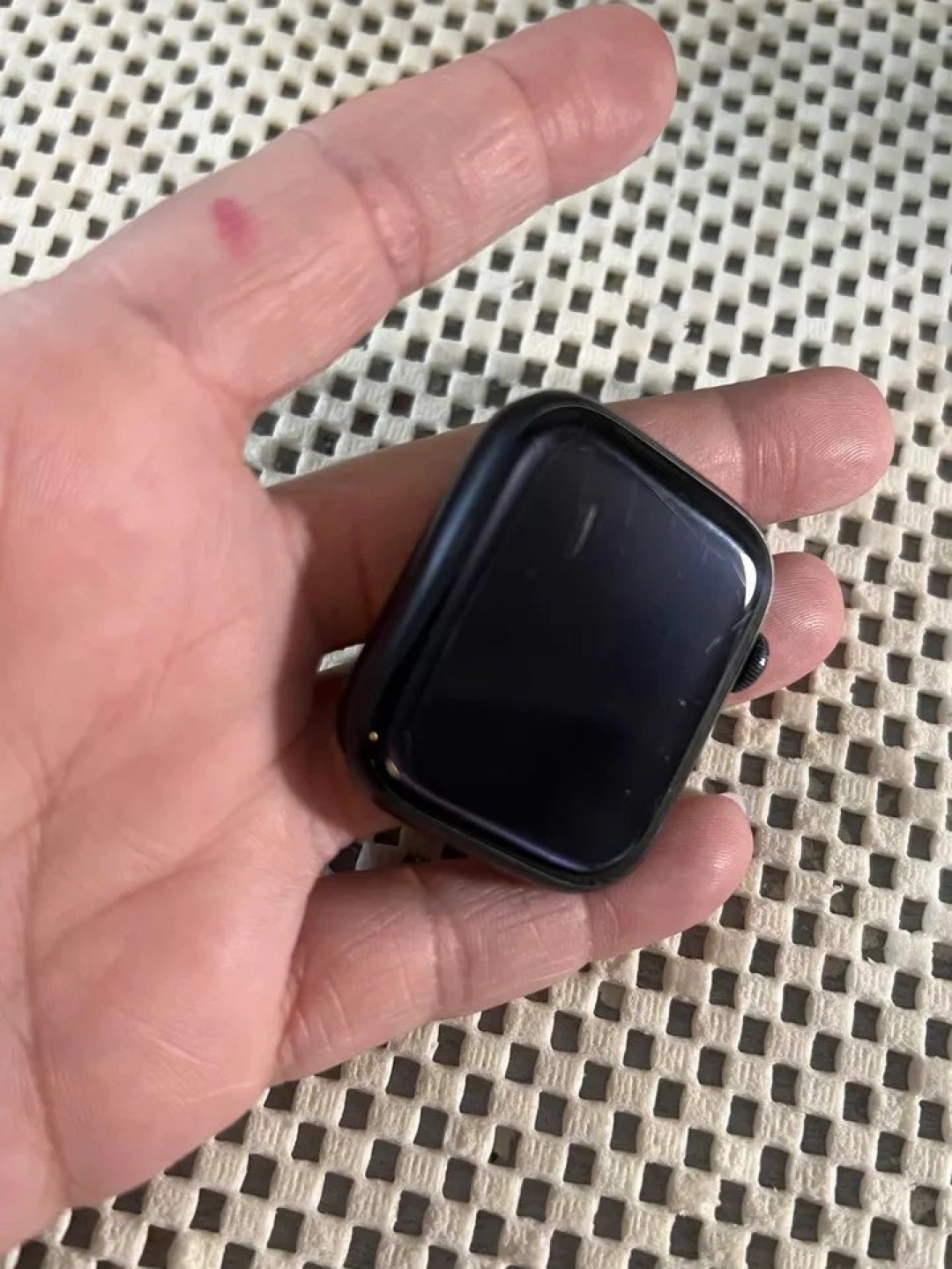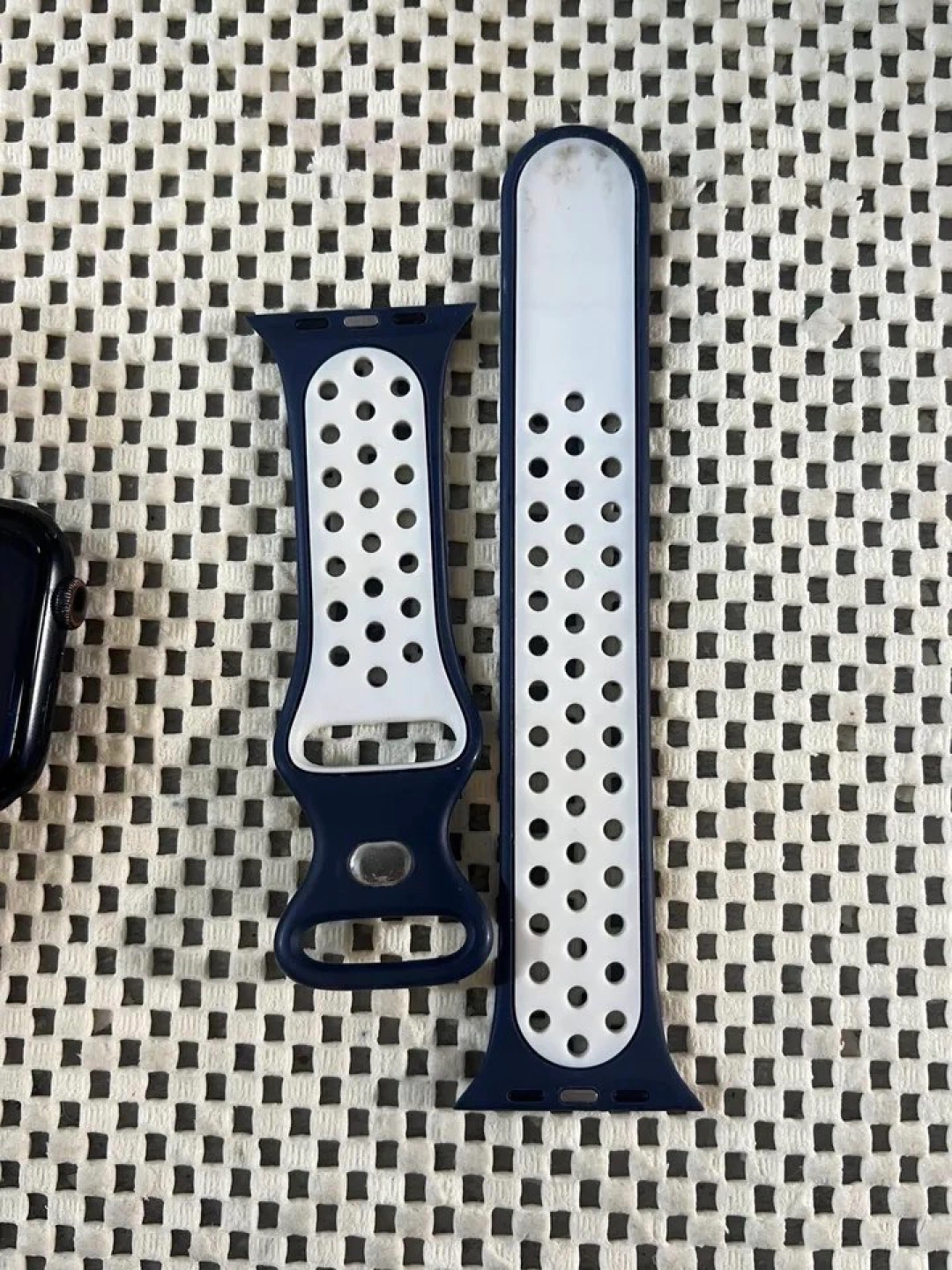 10Apple Watch Series 7 GPS model. Black space black aluminum case. Ion-X glass. Includes Nike sport band, dark blue and white. Pre-owned.