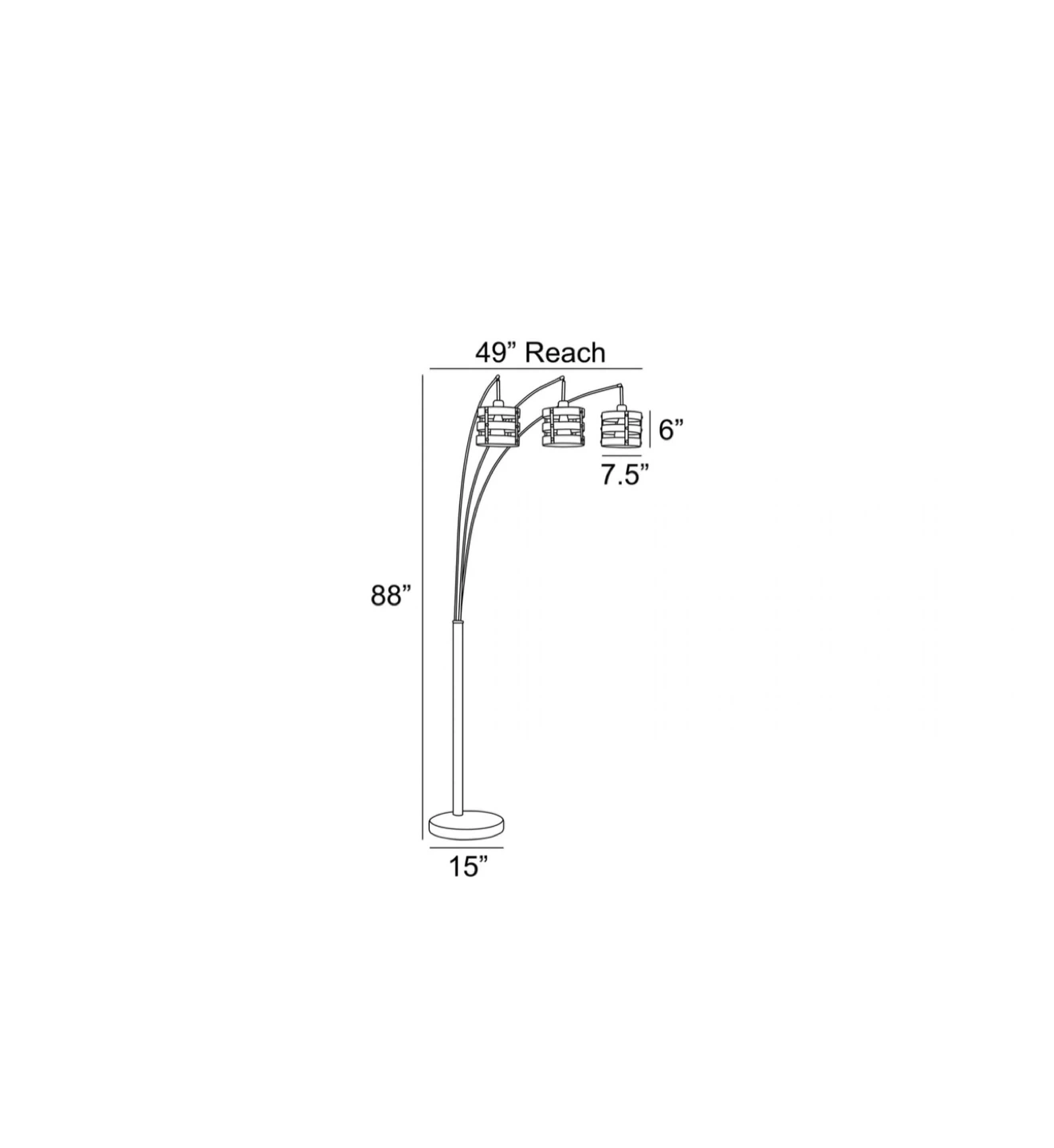 This arc floor lamp features three adjustable lights with wood-tone drum shades. It stands 88" tall and has a 49" reach. The shades are 6" in diameter and 7.5" tall, with a 15" diameter base.