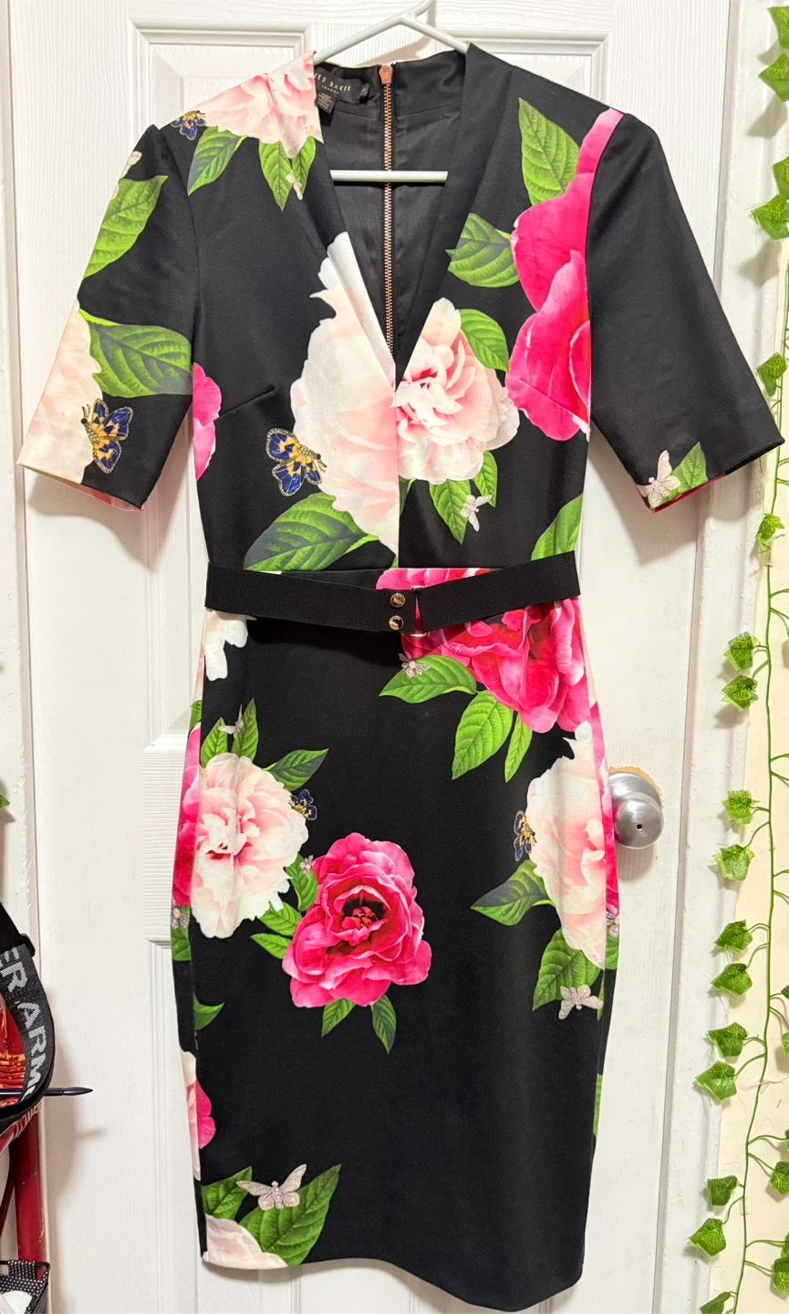 A black sheath dress with a vibrant floral print. It features a gold-tone back zipper closure and short sleeves. Made from a smooth fabric. Ted Baker
