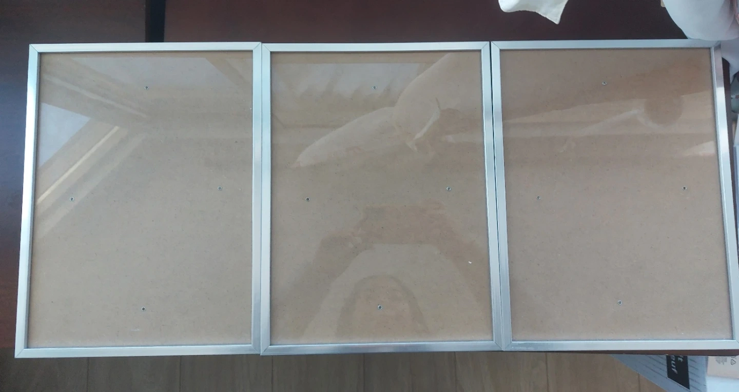 These are picture frames with a silver-coloured metal frame. Each frame section has a clear glass front and a cardboard backing held in place by small clips.