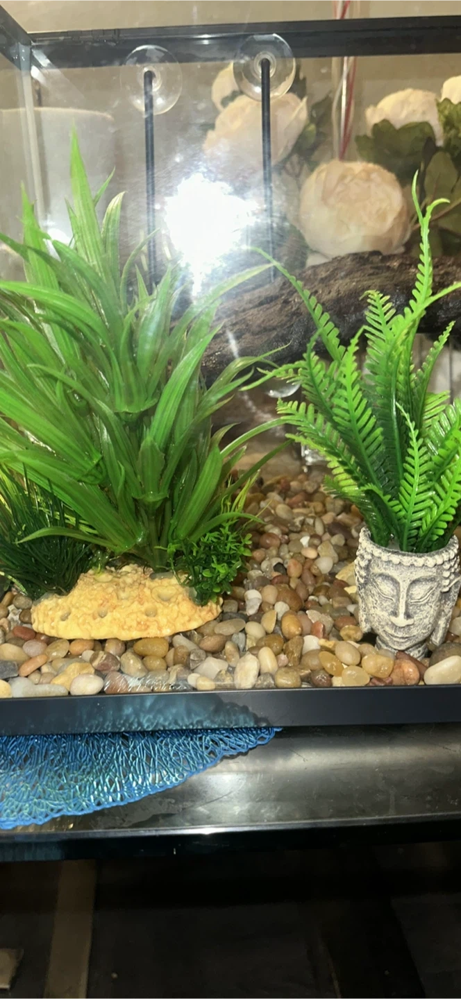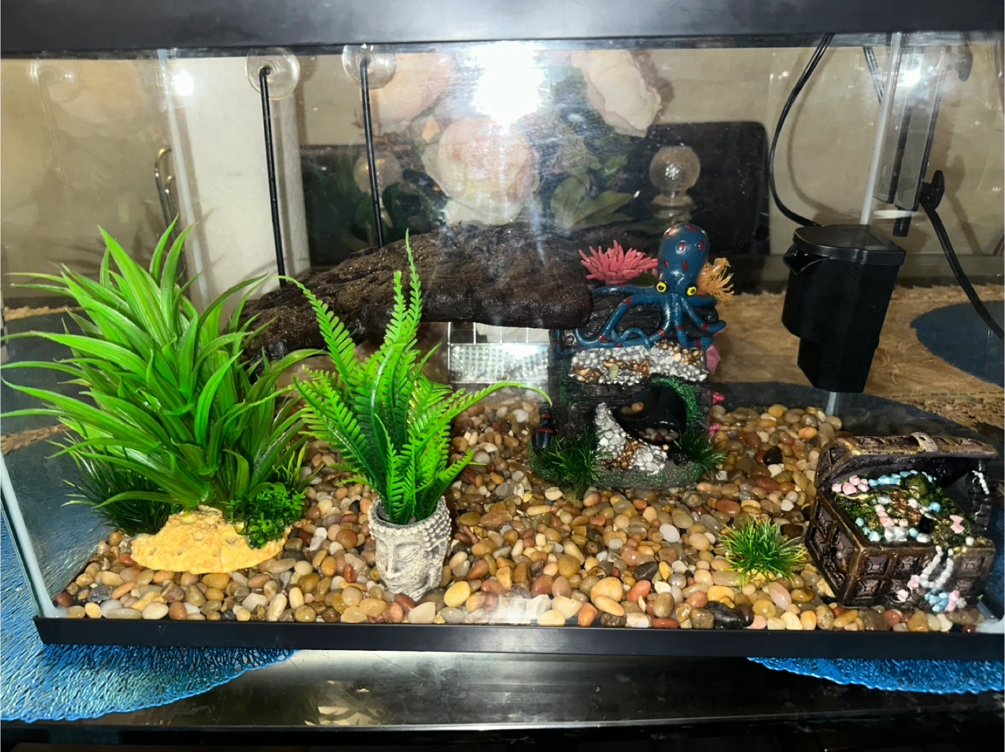 60Selling a used aquarium with various accessories! It includes some artificial plants, a treasure chest decoration, an octopus decoration, gravel, and a thermometer. Also included is a Top Fin underwater world element filter cartridge with a Light bulb of 50w Tank size 30x 12x18