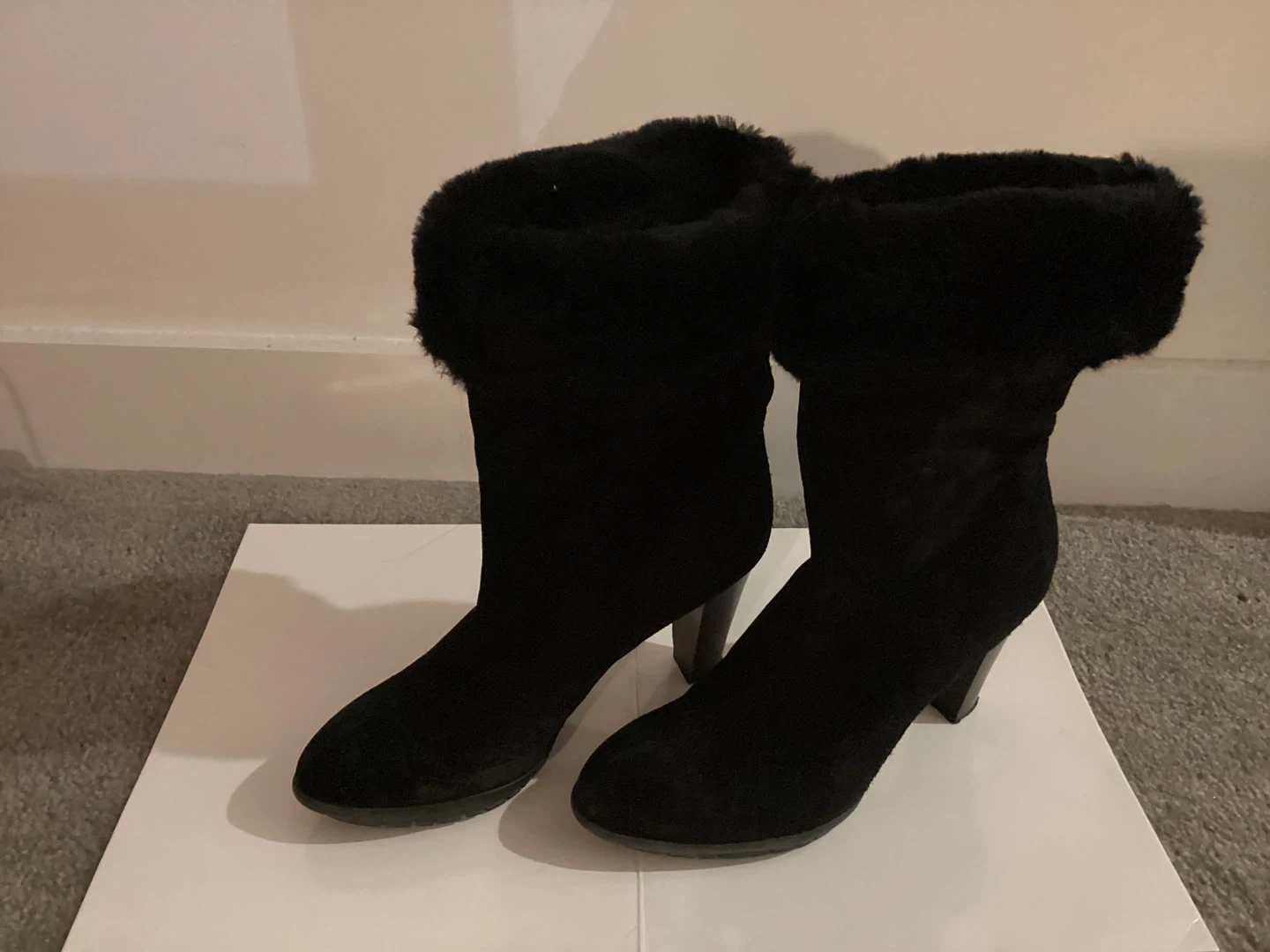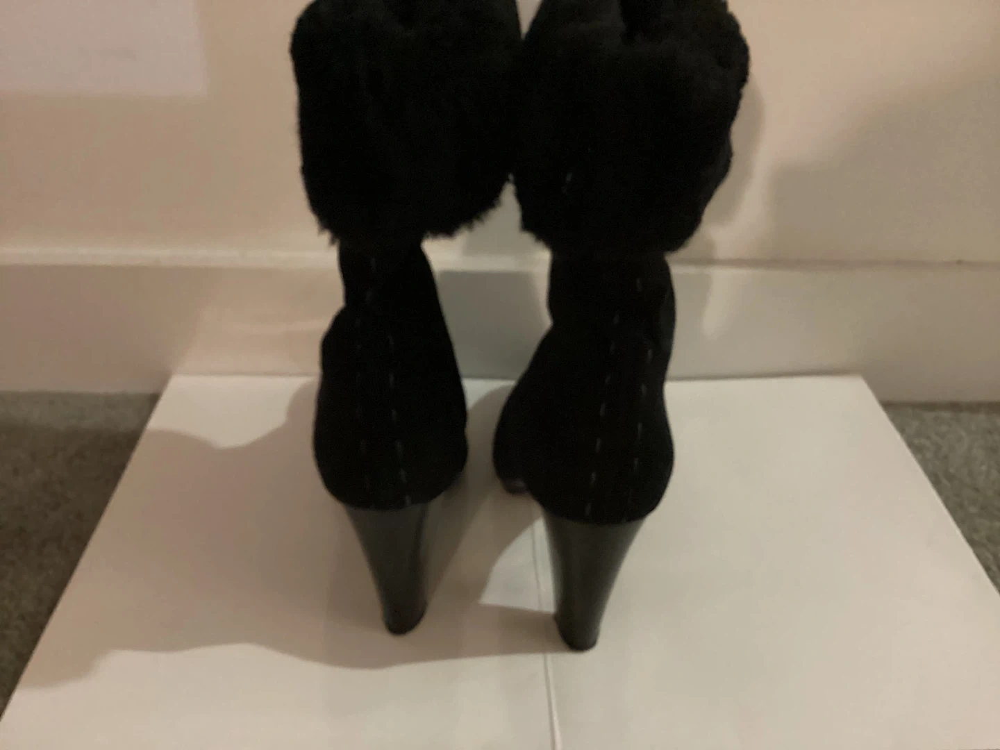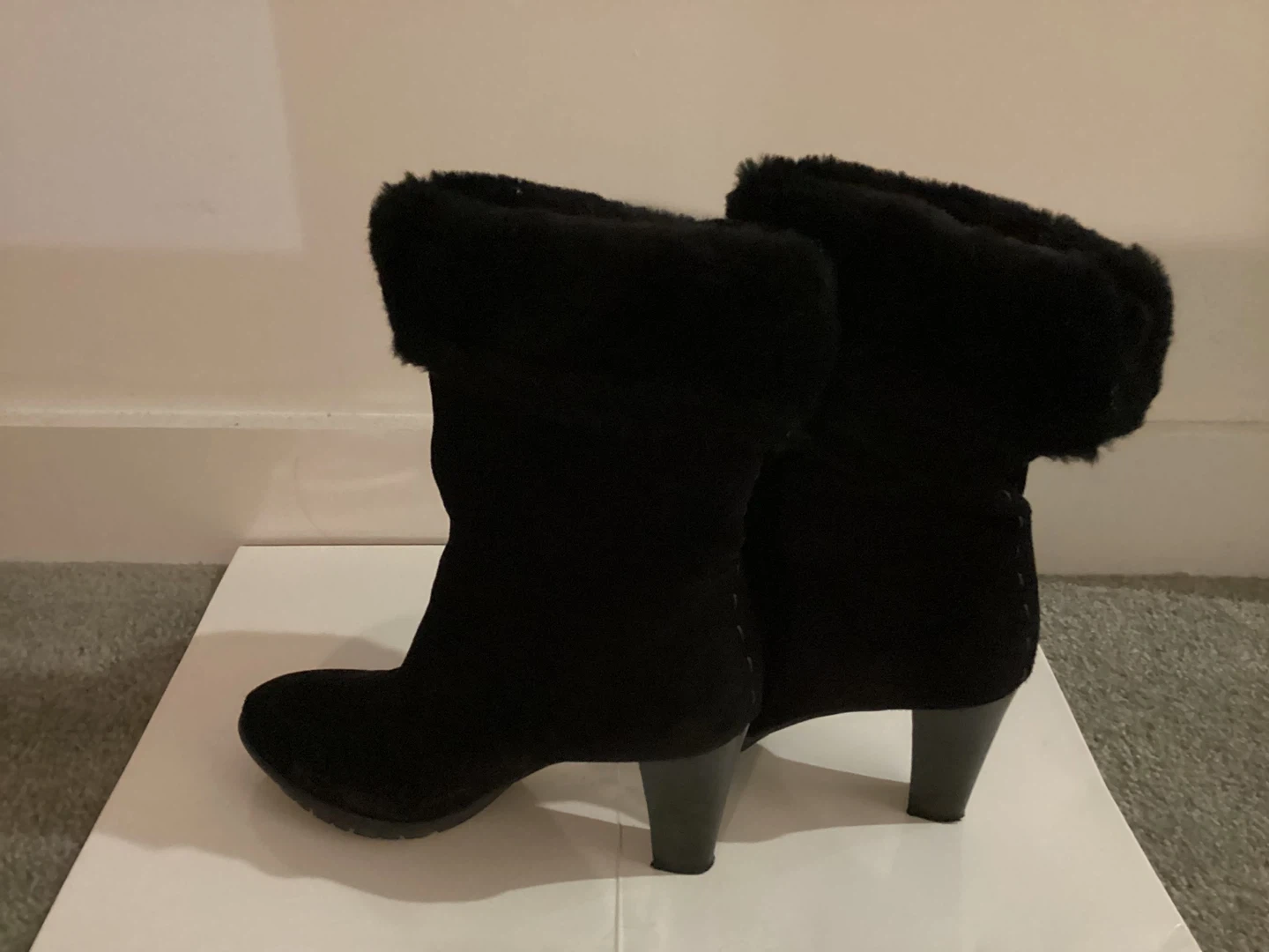 10These are a pair of stylish black ankle suede boots, perfect for adding a touch of warmth and style to your outfit! They feature a cozy fur trim around the top and a comfortable heel height. These boots are in great condition and ready for a new home