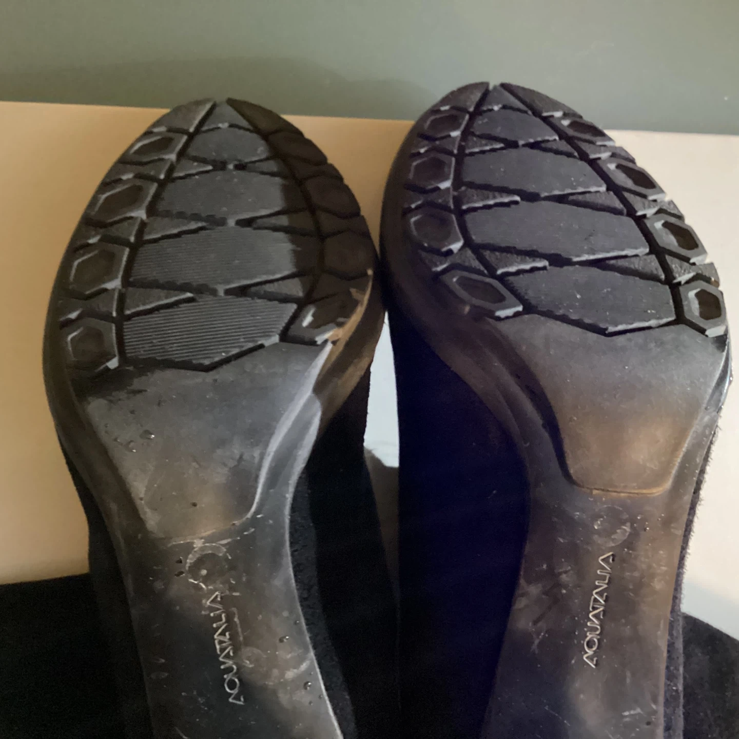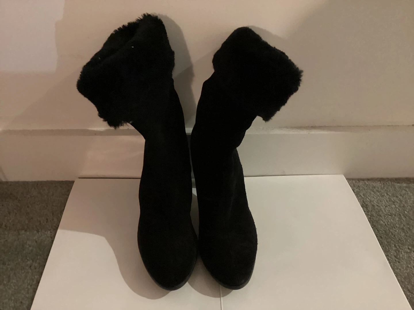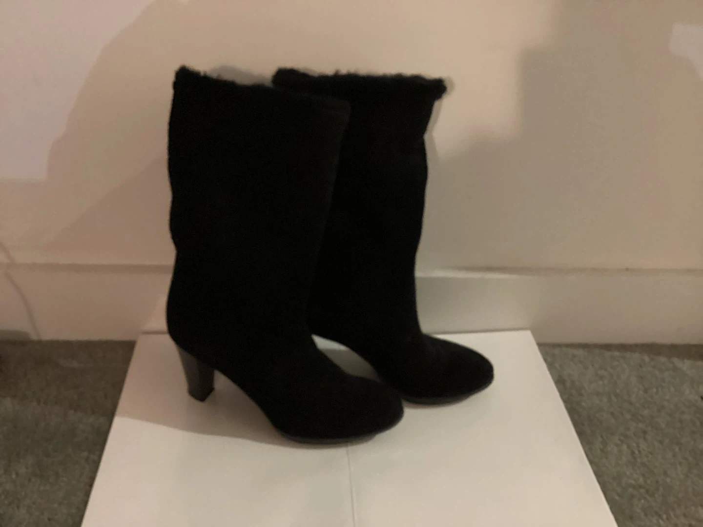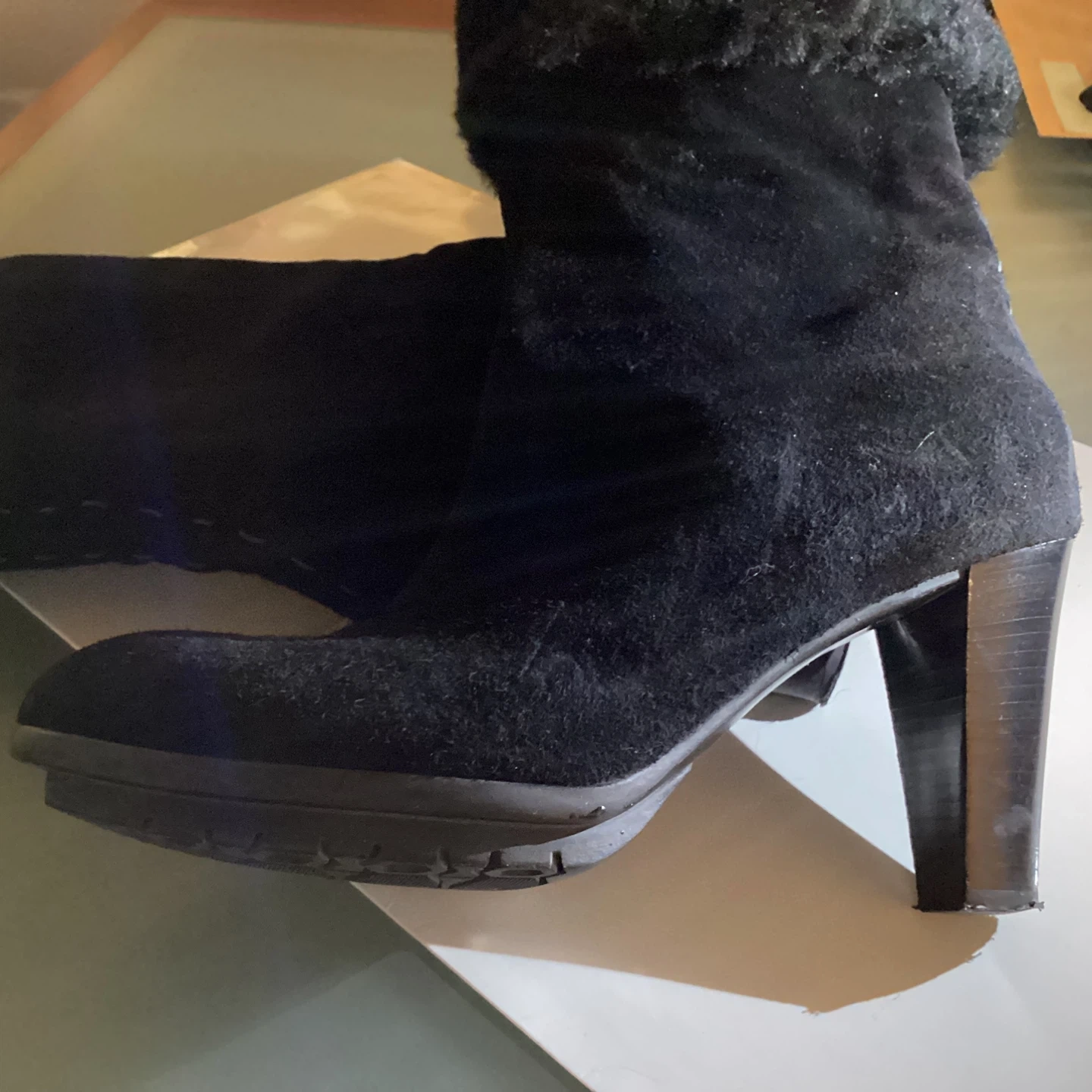 10These are a pair of stylish black ankle suede boots, perfect for adding a touch of warmth and style to your outfit! They feature a cozy fur trim around the top and a comfortable heel height. These boots are in great condition and ready for a new home