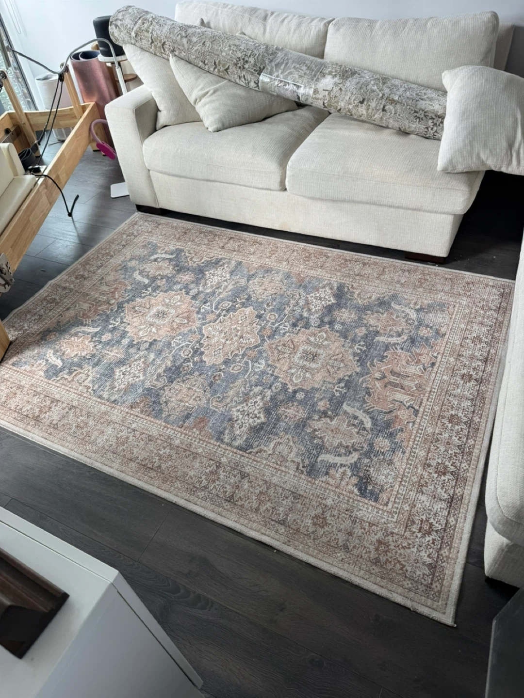 Selling a lovely area rug with a detailed pattern in shades of blue, brown, and beige. It's in great condition and ready to add warmth and style to your space! Smoke free home no stains or damage