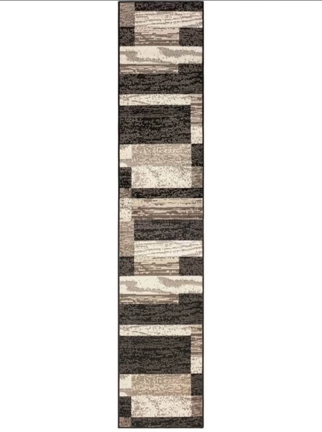 Area rug runner in shades of brown, beige, and black. It's in great condition and ready for a new home!
