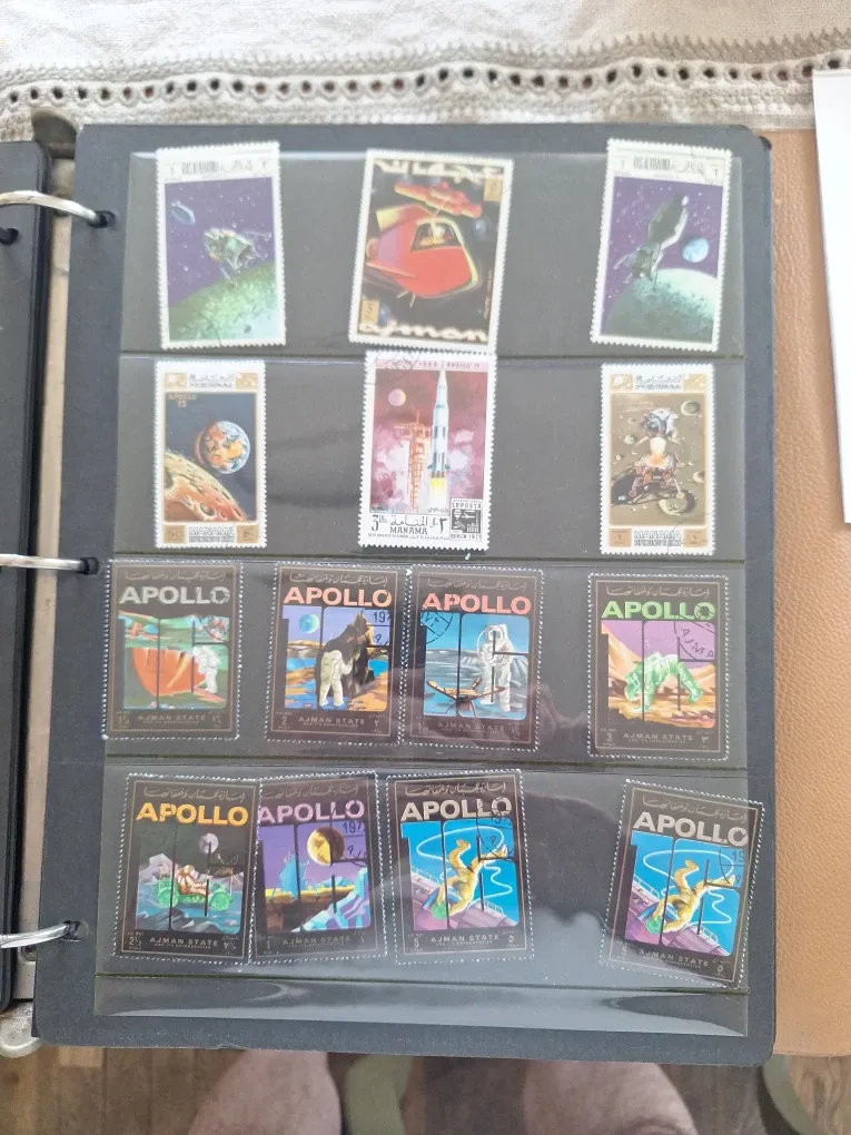 This is a collection of Ajman State stamps featuring the Apollo program from 1971. The stamps depict various scenes related to space exploration. They are in a stamp album, ready for a collector.