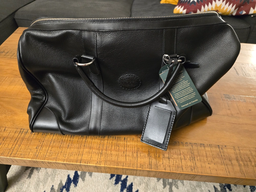 Brand new, never used, retails for $498+tax - unwanted gift. Cash only, no interac or e-transfer. ROOTS DESCRIPTION: A smaller update of our ultimate weekender bag, our Small Banff Bag is roomy enough for that weekend getaway, yet compact enough to throw over your shoulder. - Designed and handcrafted in Canada in our factory in Toronto - Top zipper closure with one main compartment - Double handles with snap grip - Feet to avoid scuffing - Leather luggage tag - Interior passport pocket with zipper closure LINK: https://www.roots.com/ca/en/small-banff-bag-cervino-53386618.html?gad_source=1&gclsrc=ds DIMENSIONS 19”(L) x 10”(H) x 11”(D) Adjustable/removable shoulder strap 42" - 49", 1.5" width LEATHER Cervino is made in a tannery in the north of Italy close to Venice Cervino is an elegant, timeless semi-aniline leather It has a consistent pebbled grain and natural finish