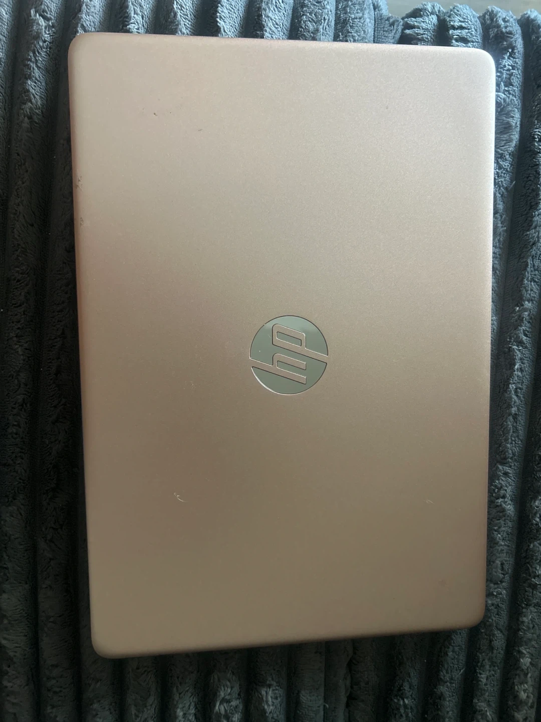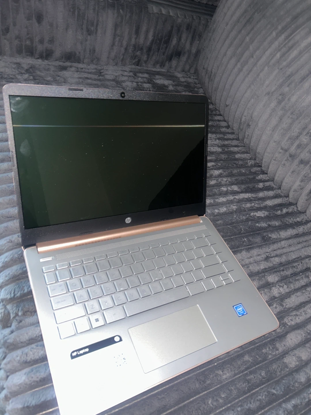 This is an HP laptop in a rose gold color. It's a lightweight design perfect for everyday use. The screen has a thin horizontal line of color distortion. It's a functional laptop for various tasks.