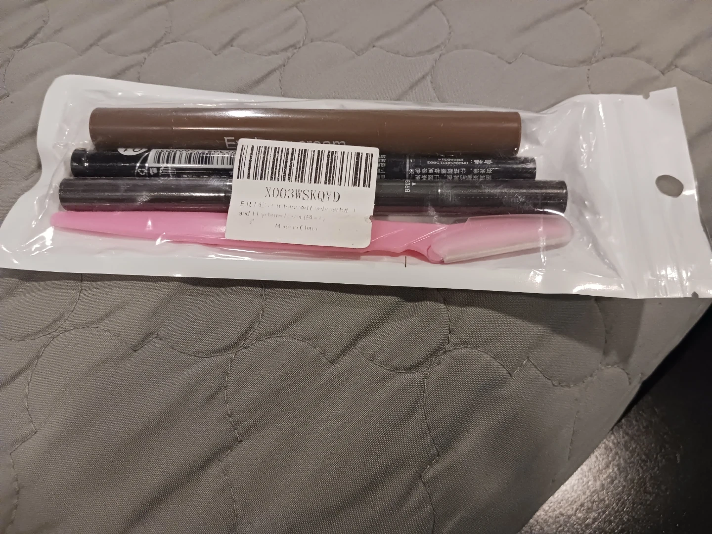 I'm selling a set includes three Drawing eyebrow pencils, each with a brush tip for blending. Also includes one pink facial razor. Perfect for precise eyebrow shaping and grooming!
