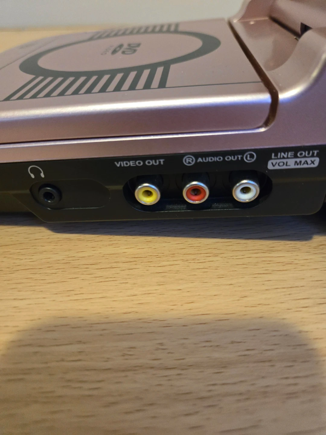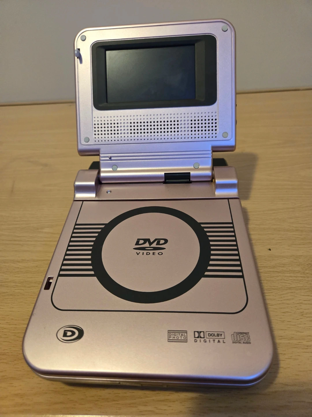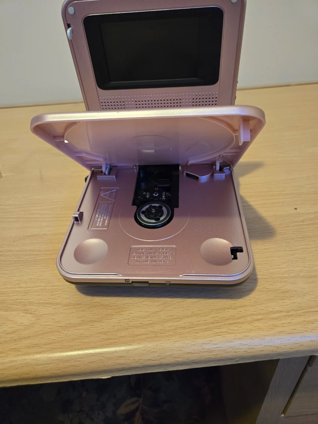 This is a portable DVD player in a lovely pink colour. It includes a built-in screen for viewing your favourite movies on the go. Features Dolby Digital audio support for a better sound experience. Missing 9V battery charging cable.