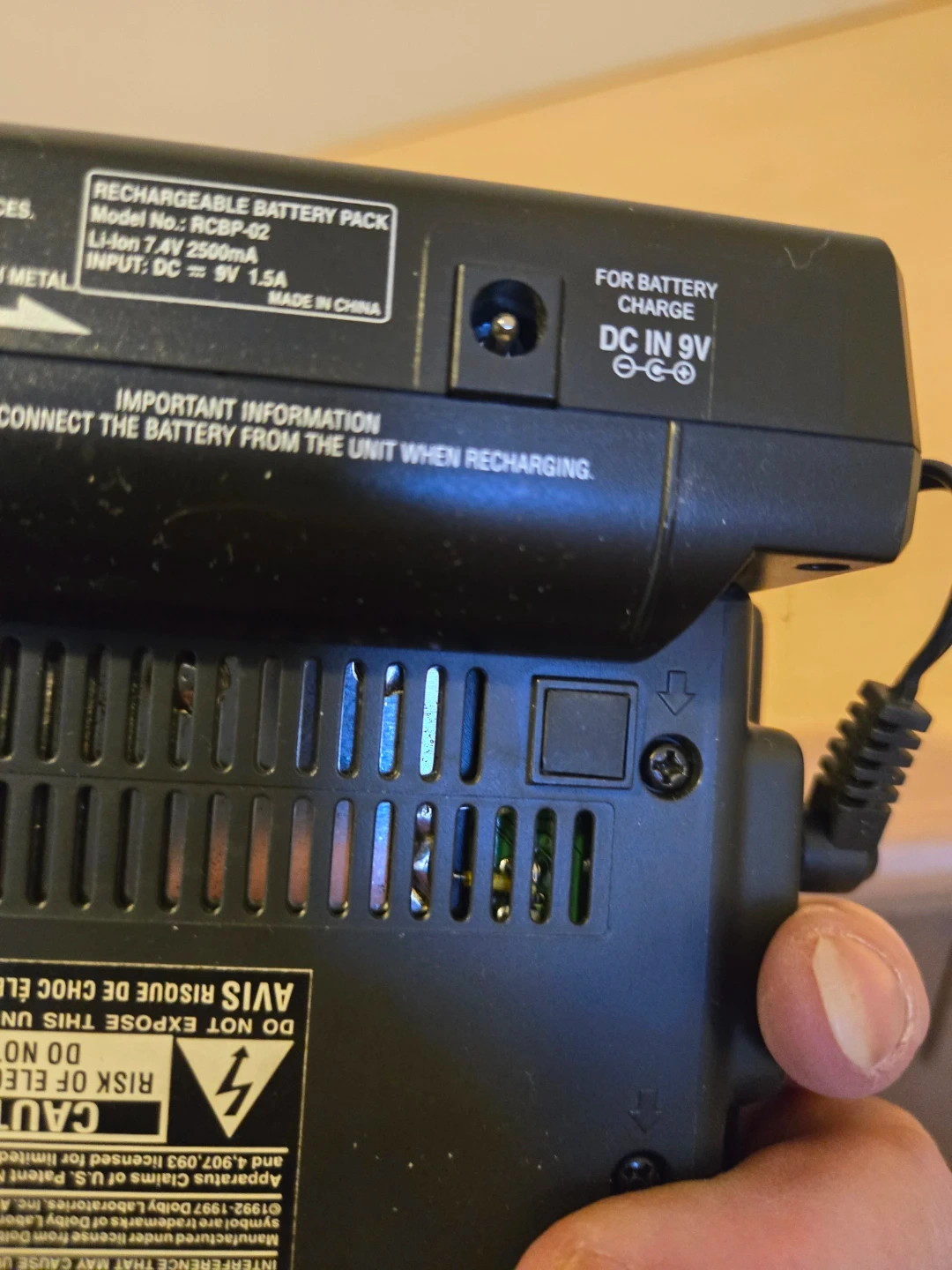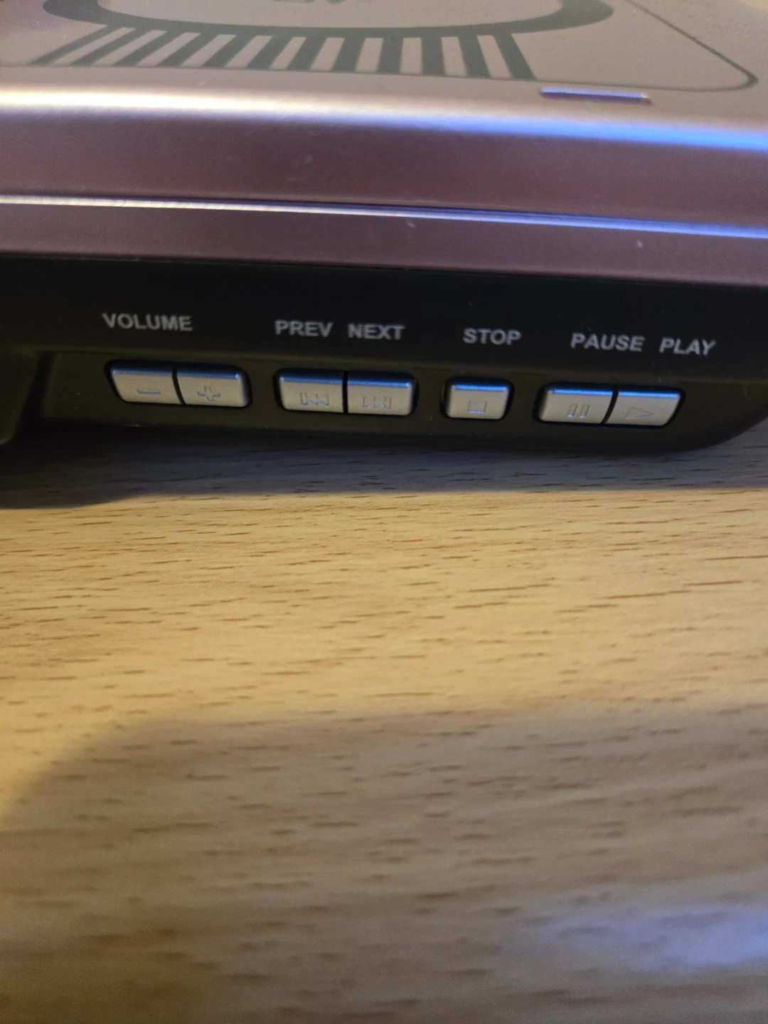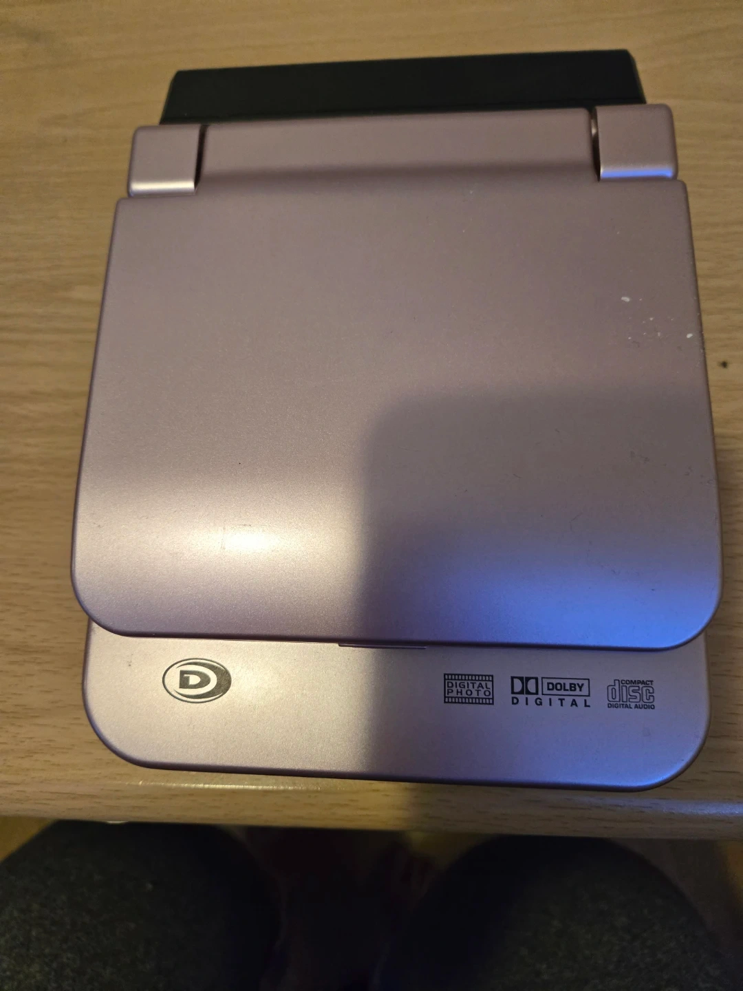 This is a portable DVD player in a lovely pink colour. It includes a built-in screen for viewing your favourite movies on the go. Features Dolby Digital audio support for a better sound experience. Missing 9V battery charging cable.