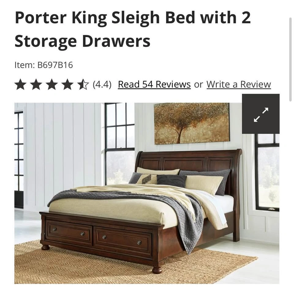Bring timeless elegance and functionality to your bedroom with this Ashley Porter King Sleigh Bed. Crafted with a rich, burnished finish and traditional sleigh design, this bed makes a stunning centerpiece for any room. Key Features: King-size sleigh bed frame 2 spacious built-in storage drawers at the footboard (perfect for bedding, pillows, or clothing) Durable wood construction with a warm, classic finish Sleek, curved headboard and footboard for a traditional yet refined look 🛏️ Condition: Like new – gently used and very well cared for. No major scratches, dents, or damage. 📏 Dimensions (approx.): Width: 81.25" Depth: 94.25" Height: 57.25" 💰 Retail Price New: $1,200 (out of stock on Ashley’s) Perfect for anyone looking to upgrade their bedroom with both style and storage.