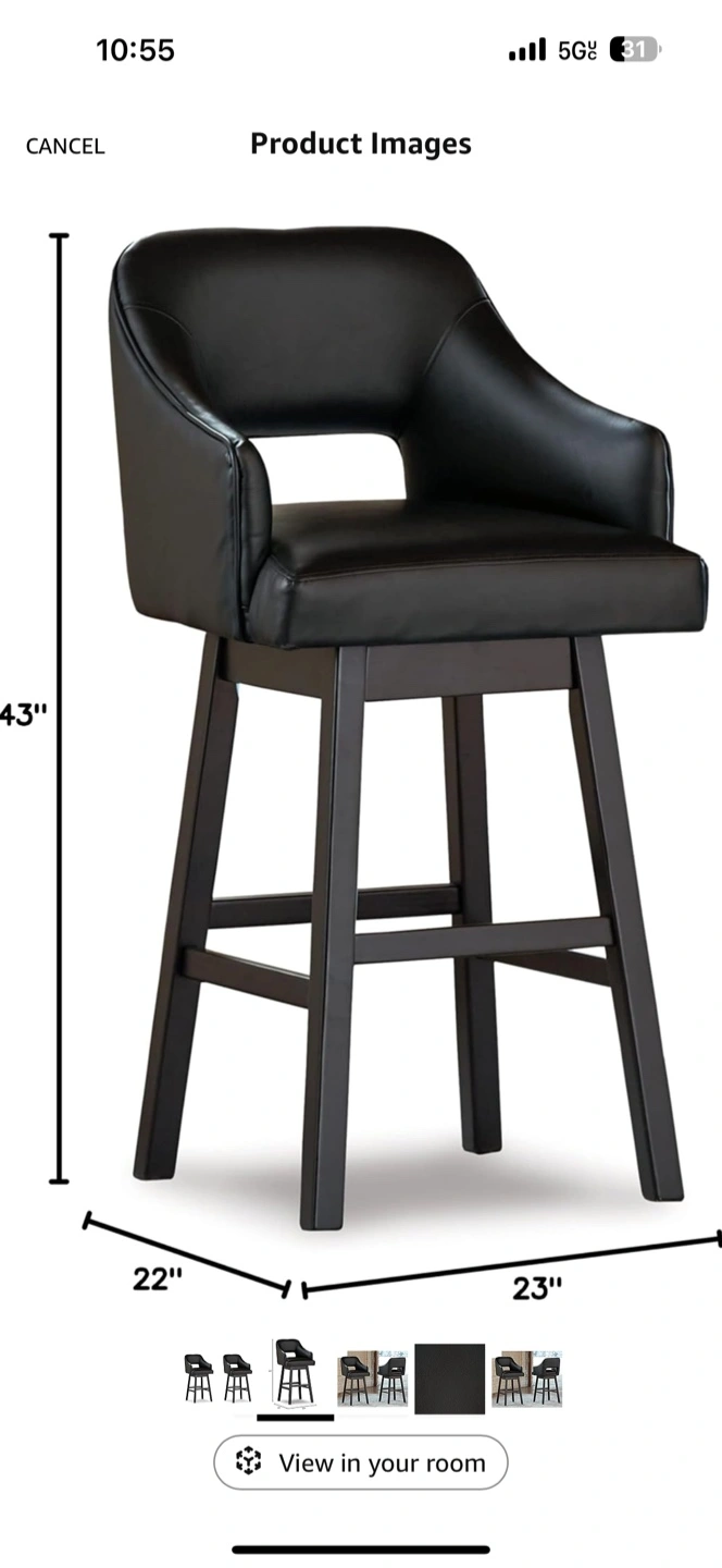 Selling a set of Ashley Tallenger swivel barstools in black. These modern pub height barstools are upholstered and provide a comfortable seating experience. The dimensions are approximately 43 inches in height, 22 inches in width, and 23 inches in depth. Brand new in the box. Never been opened