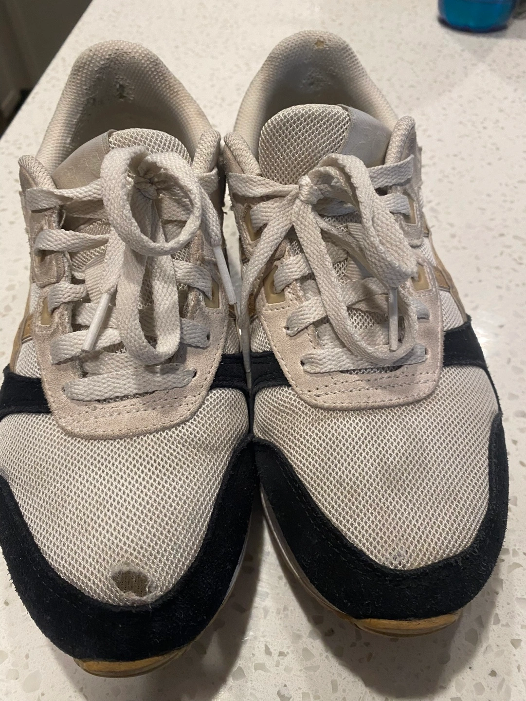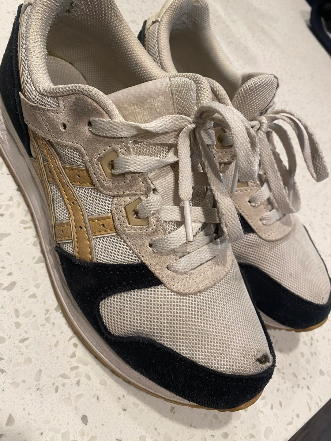 Used ASICS Gel-Lyte III sneakers. Light beige and black colorway. Some wear and tear visible. Good for everyday use.