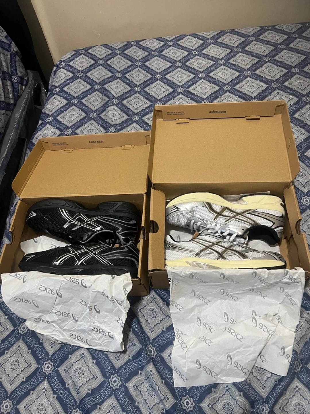 Selling a pair of Asics running shoes. One pair is black and the other is white. They both come with the original box