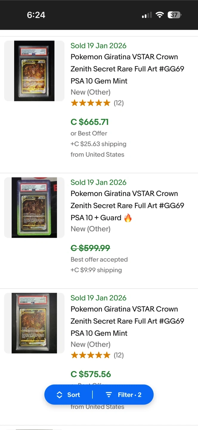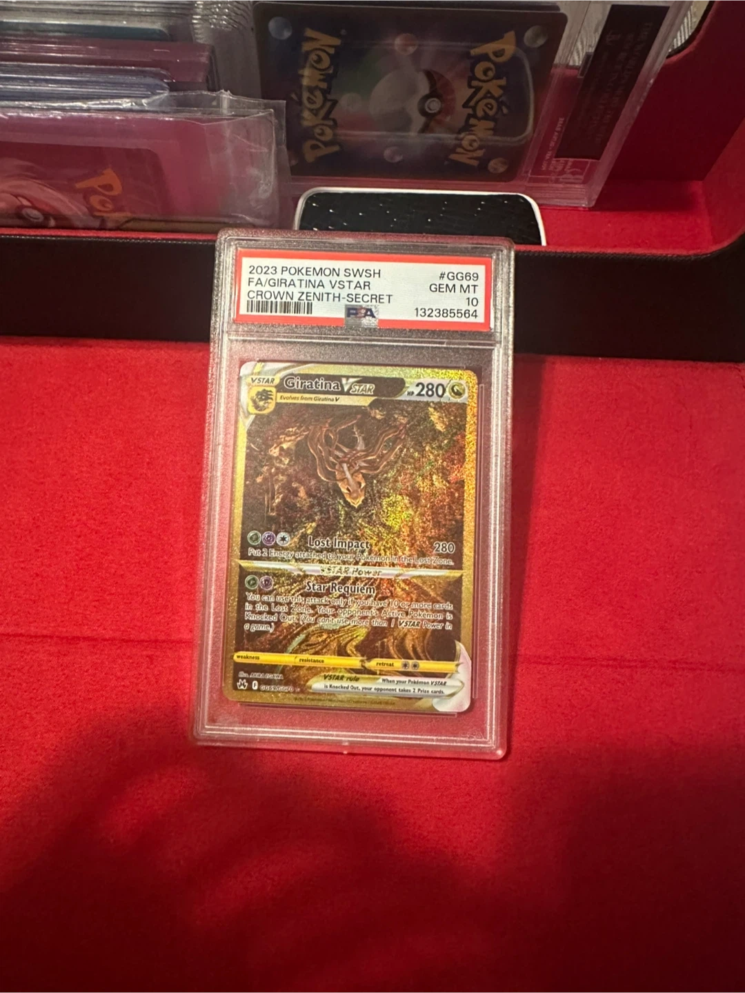 This is a 2023 Pokemon Crown Zenith Giratina VSTAR Secret Rare card, graded PSA 10 Gem Mint. It's the full art version with the GG69 designation. This highly sought-after card is a great addition for any serious collector!