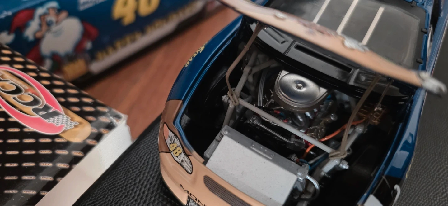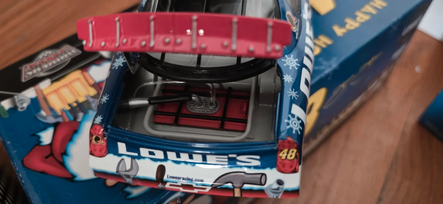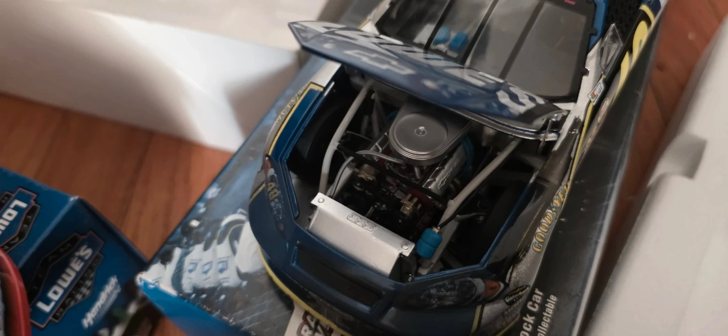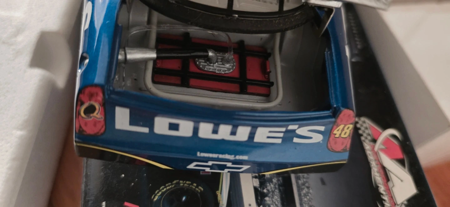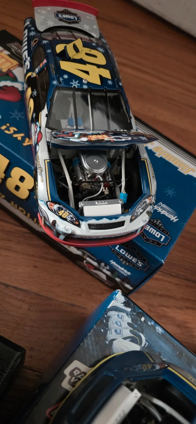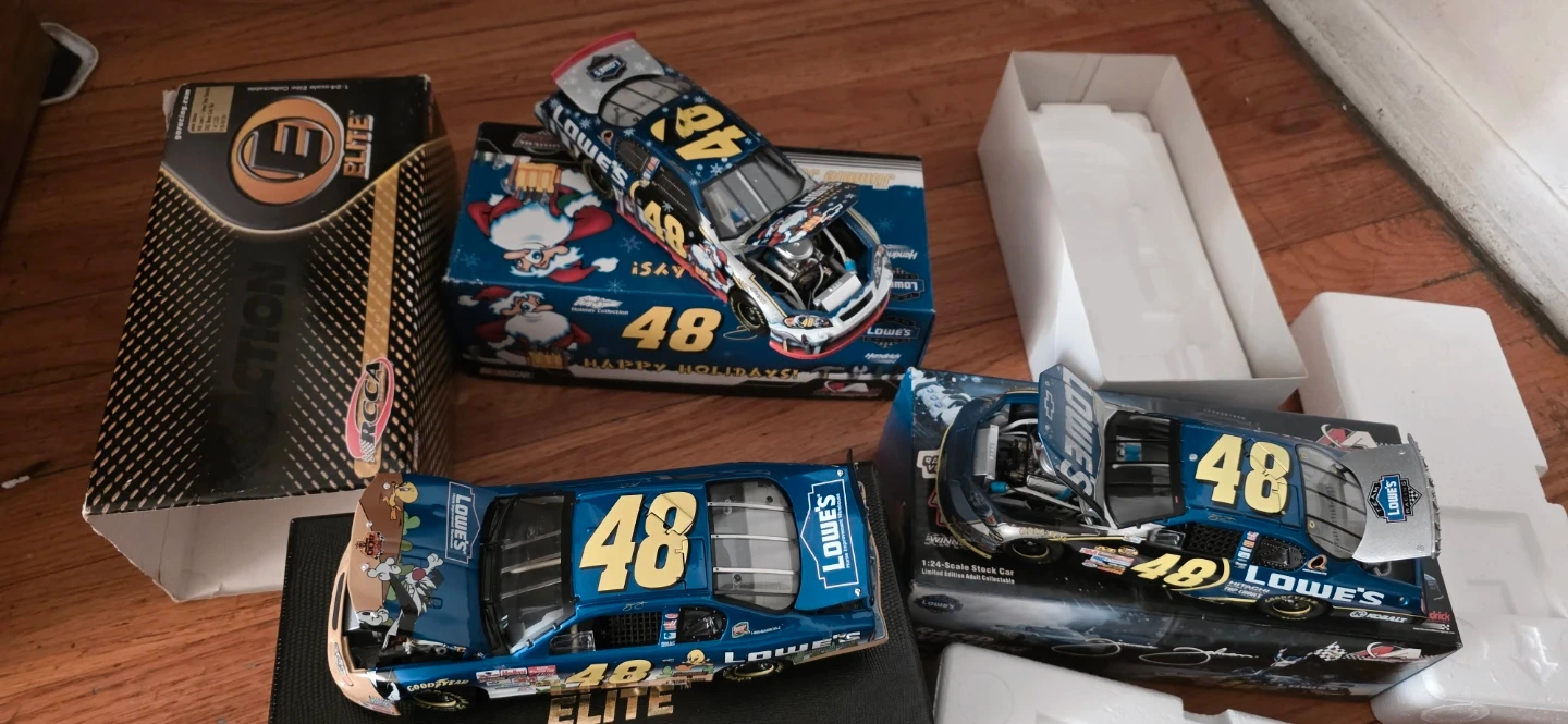 Three used 1:24 scale diecast NASCAR stock cars. Features include detailed engines and realistic race car designs. Cars are from Lowe's and Hendrick Motorsports. Comes with original boxes and packaging.one has a mark im also throwing another one