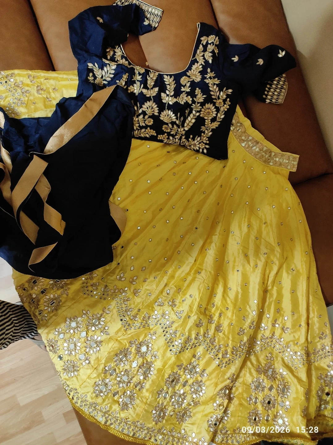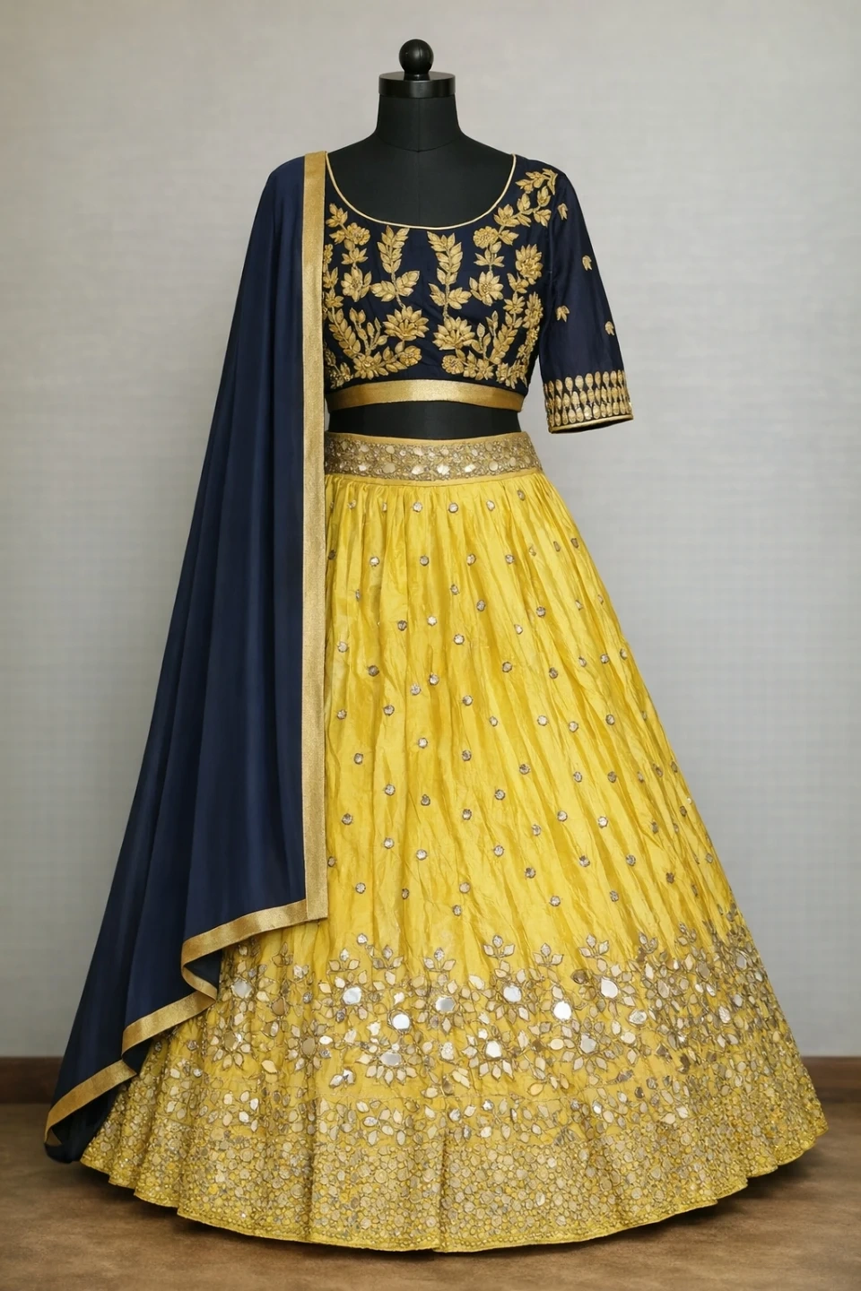 This is a vibrant yellow lehengha choli set with intricate embroidery and mirror work.