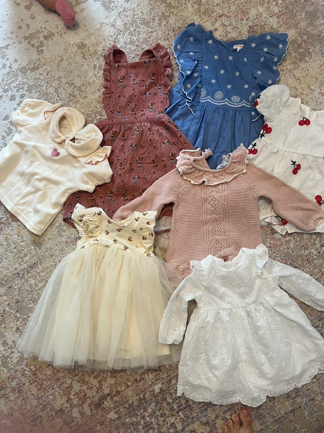 A collection of adorable baby girl dresses in various styles and colors! Perfect for dressing up your little one. These dresses feature cute details like ruffles, floral prints, and delicate embroidery. They are in great condition and ready for a new home!