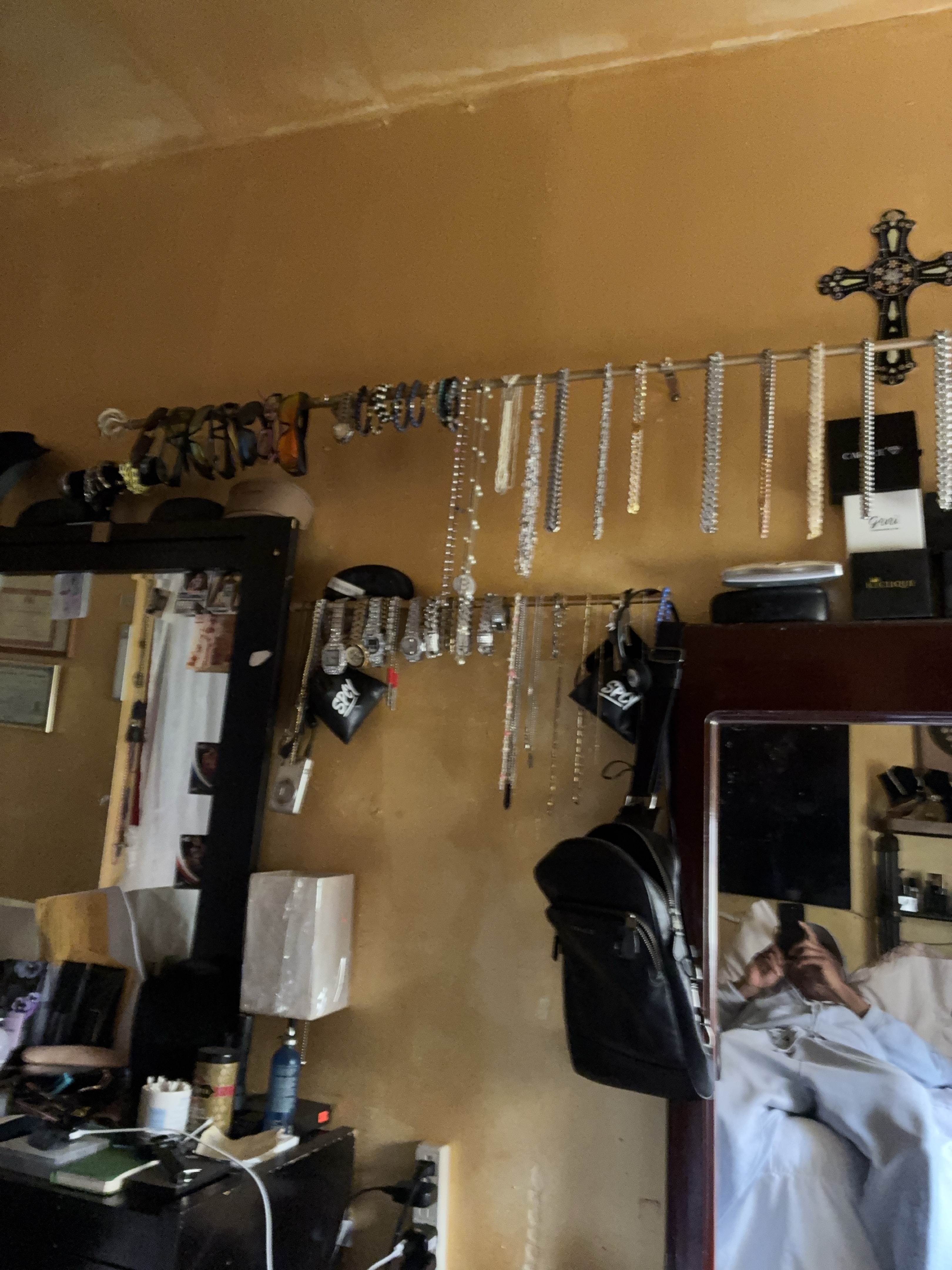 Large collection of necklaces, bracelets, and watches. Various styles and colors. Some appear to be costume jewelry. Includes a black crossbody bag.