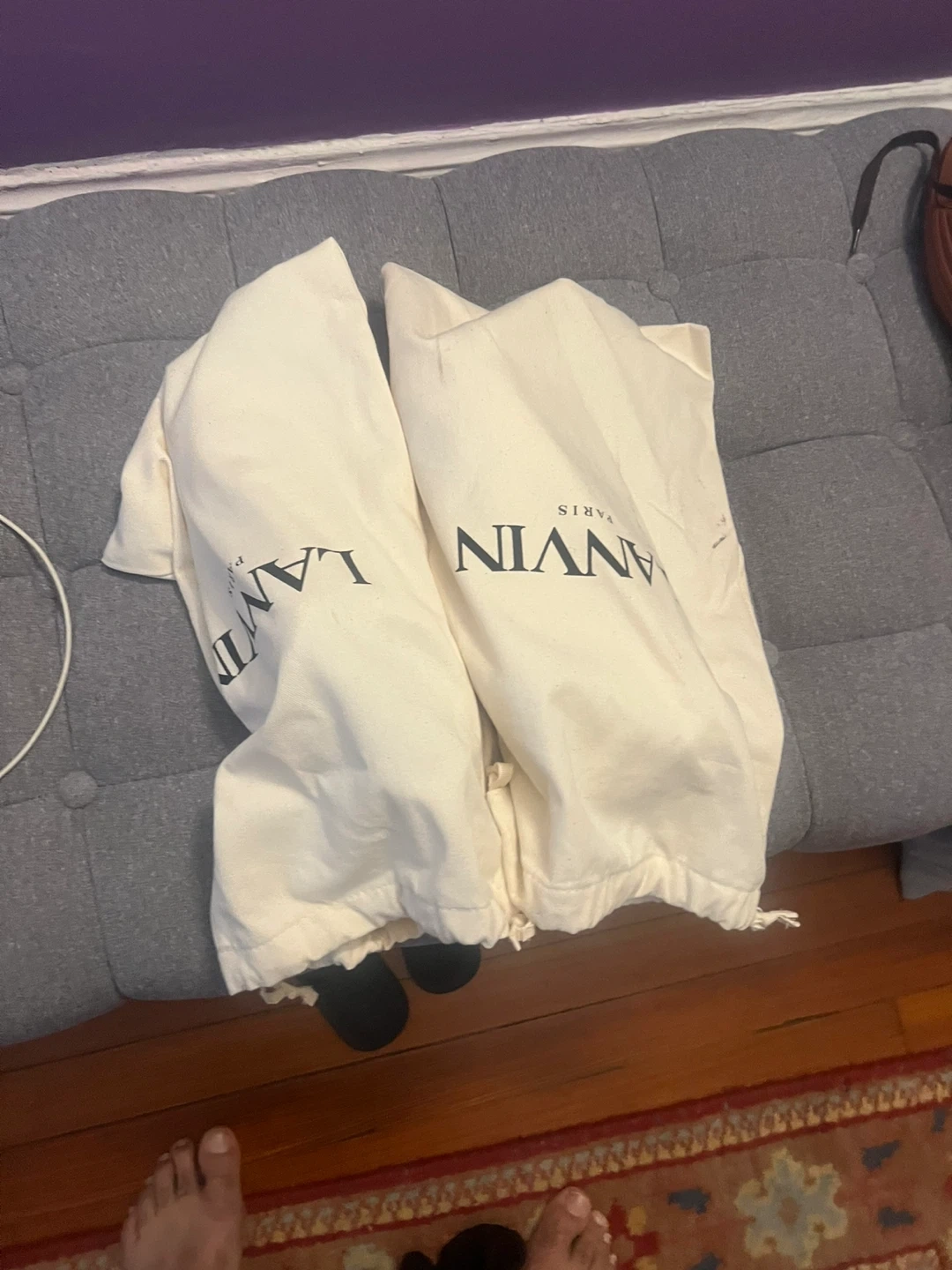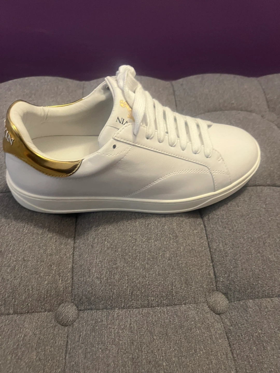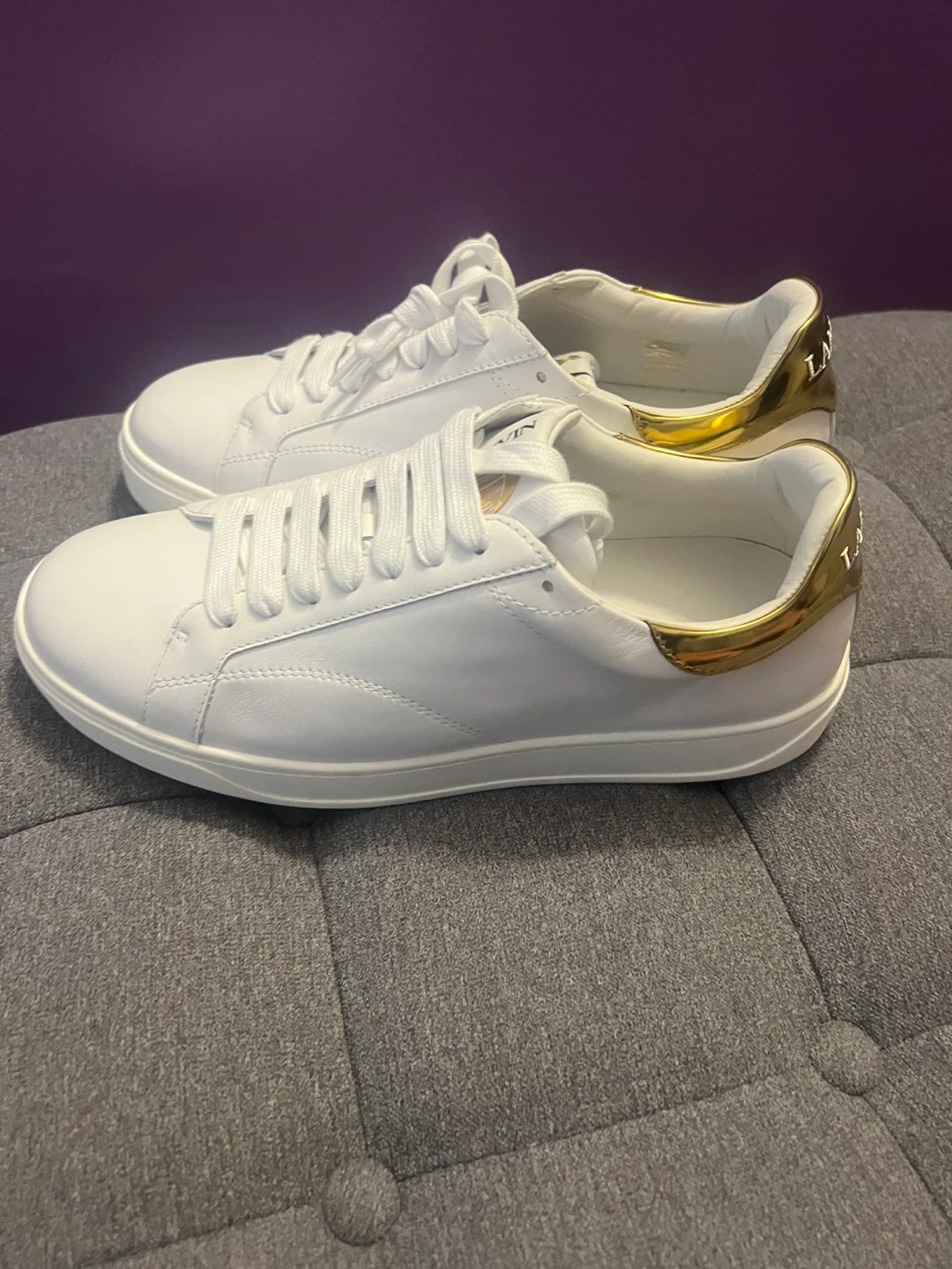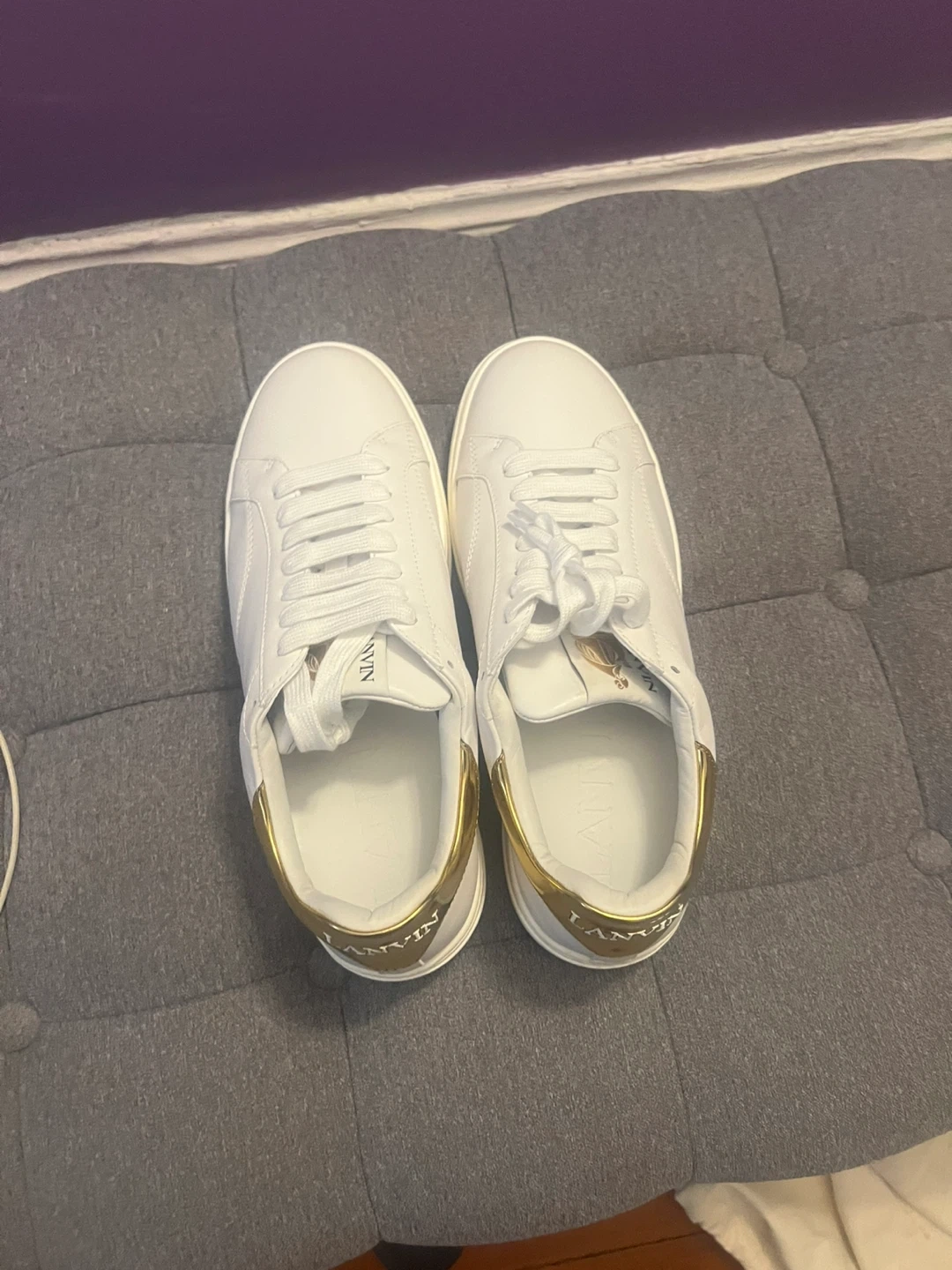White leather low top sneakers from Lanvin. These stylish sneakers feature a gold accent on the heel with the brand name embossed. Includes original dust bags.