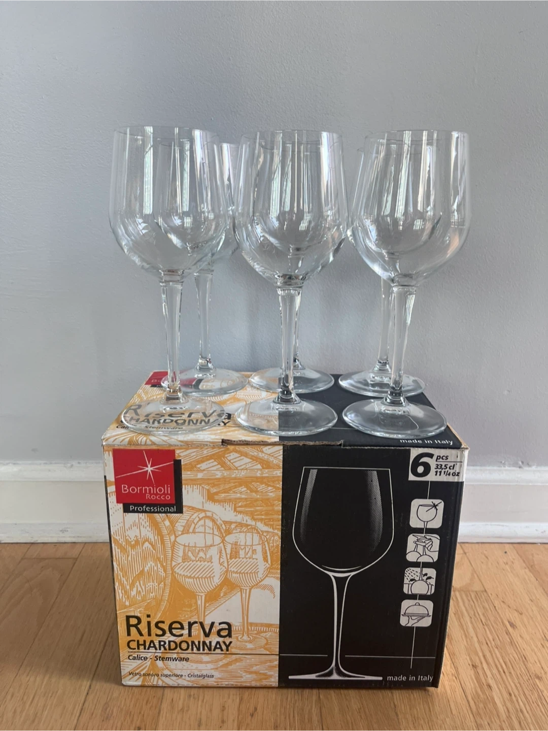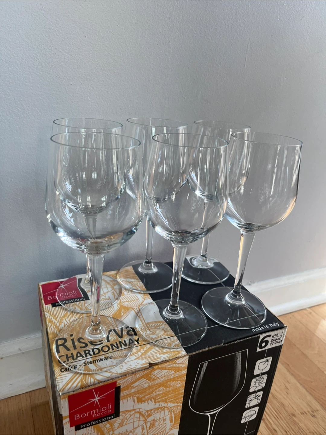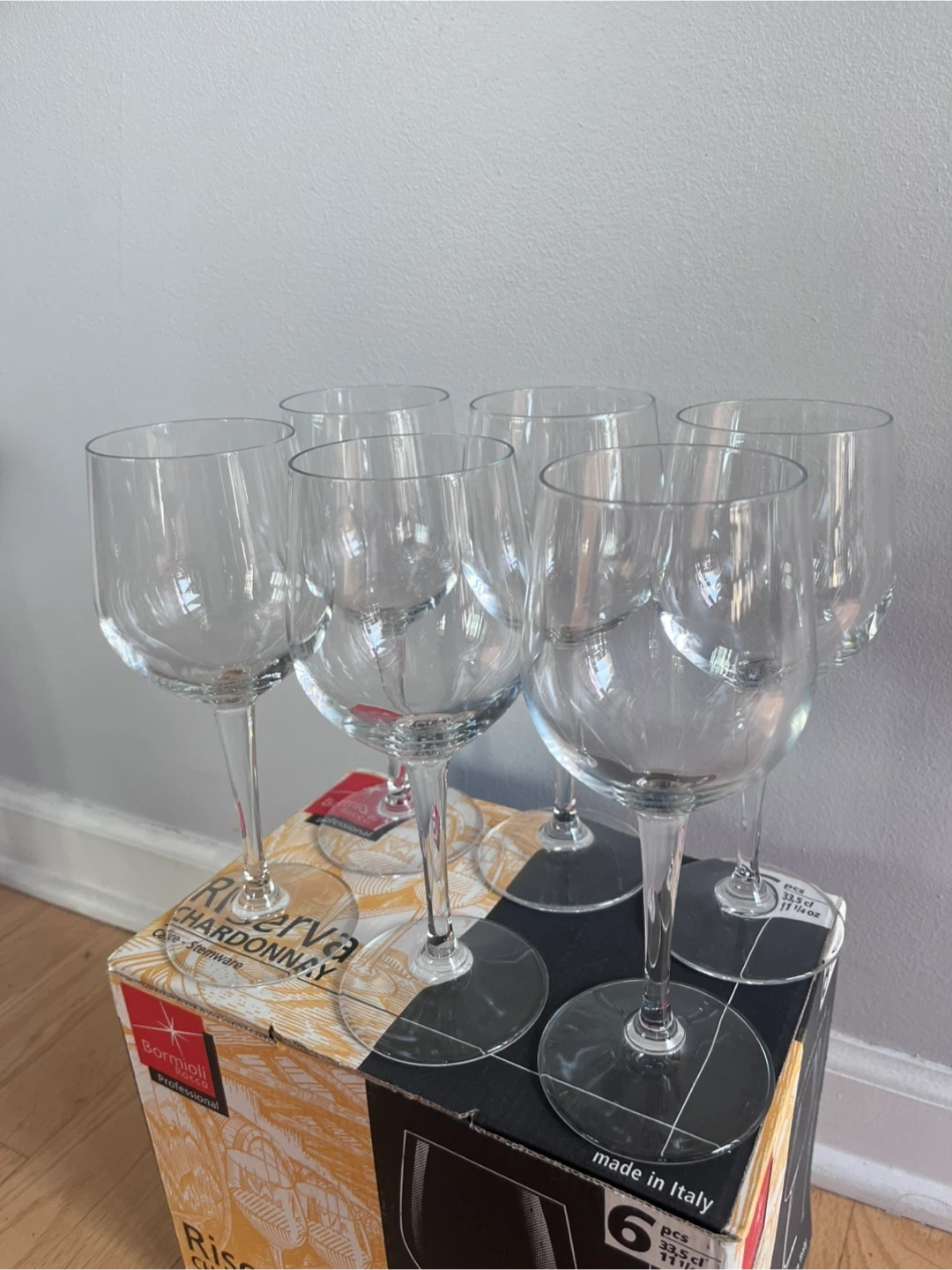 Selling a set of 6 Bormioli Rocco Chardonnay wine glasses!