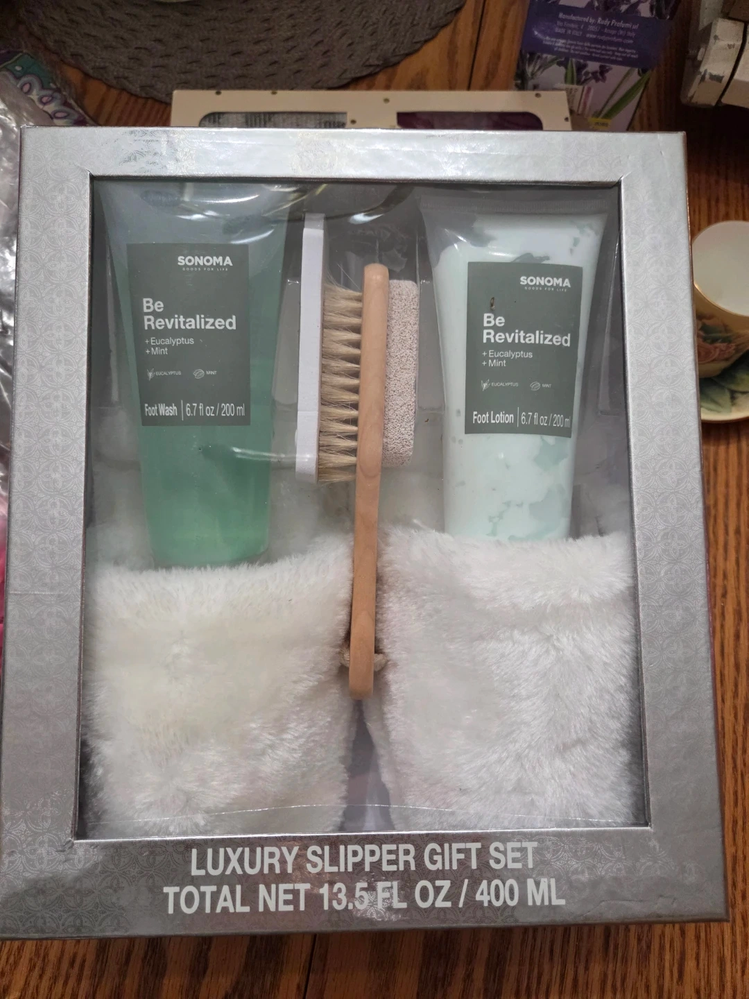 This Sonoma gift set includes fuzzy slippers, a foot wash, and foot lotion. The foot wash is 6.7 fl oz and the foot lotion is 6.7 fl oz, both with eucalyptus and mint scents. Total net volume is 13.5 fl oz or 400 ml.