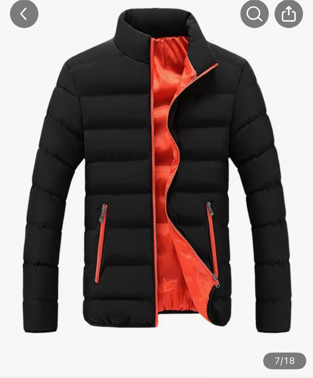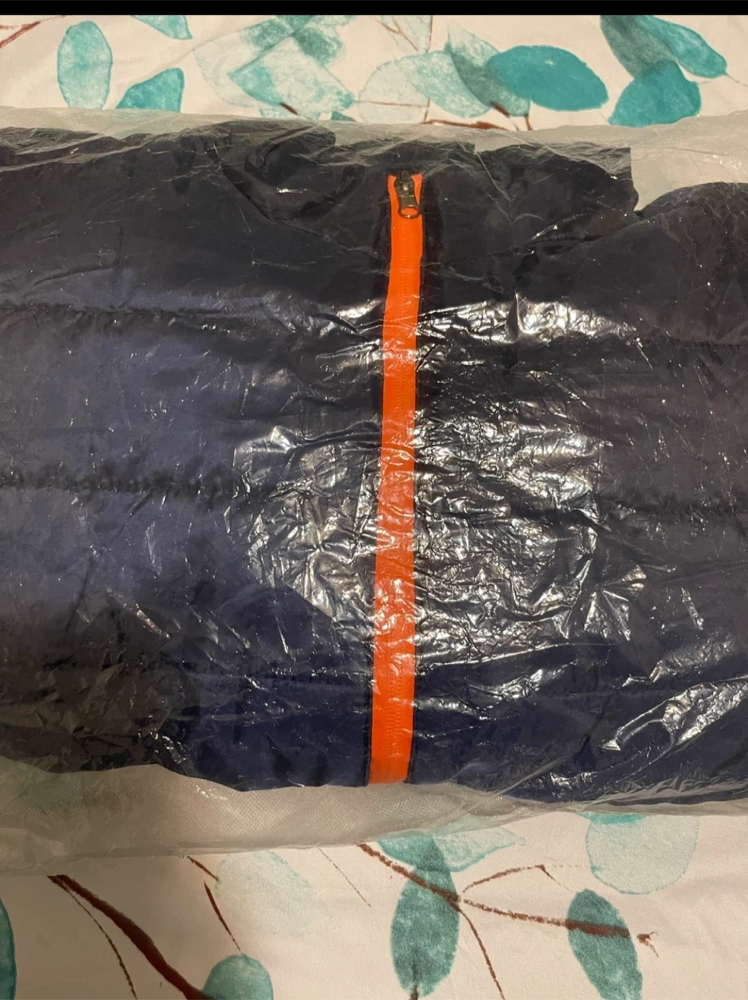 Here's a puffer jacket that I'm hoping to sell. It's a stylish and warm jacket, perfect for the colder months. The design features a central zipper and a high collar for extra protection against the wind. It's lightweight and portable, making it easy to carry around. It is navy blue with an orange zipper.