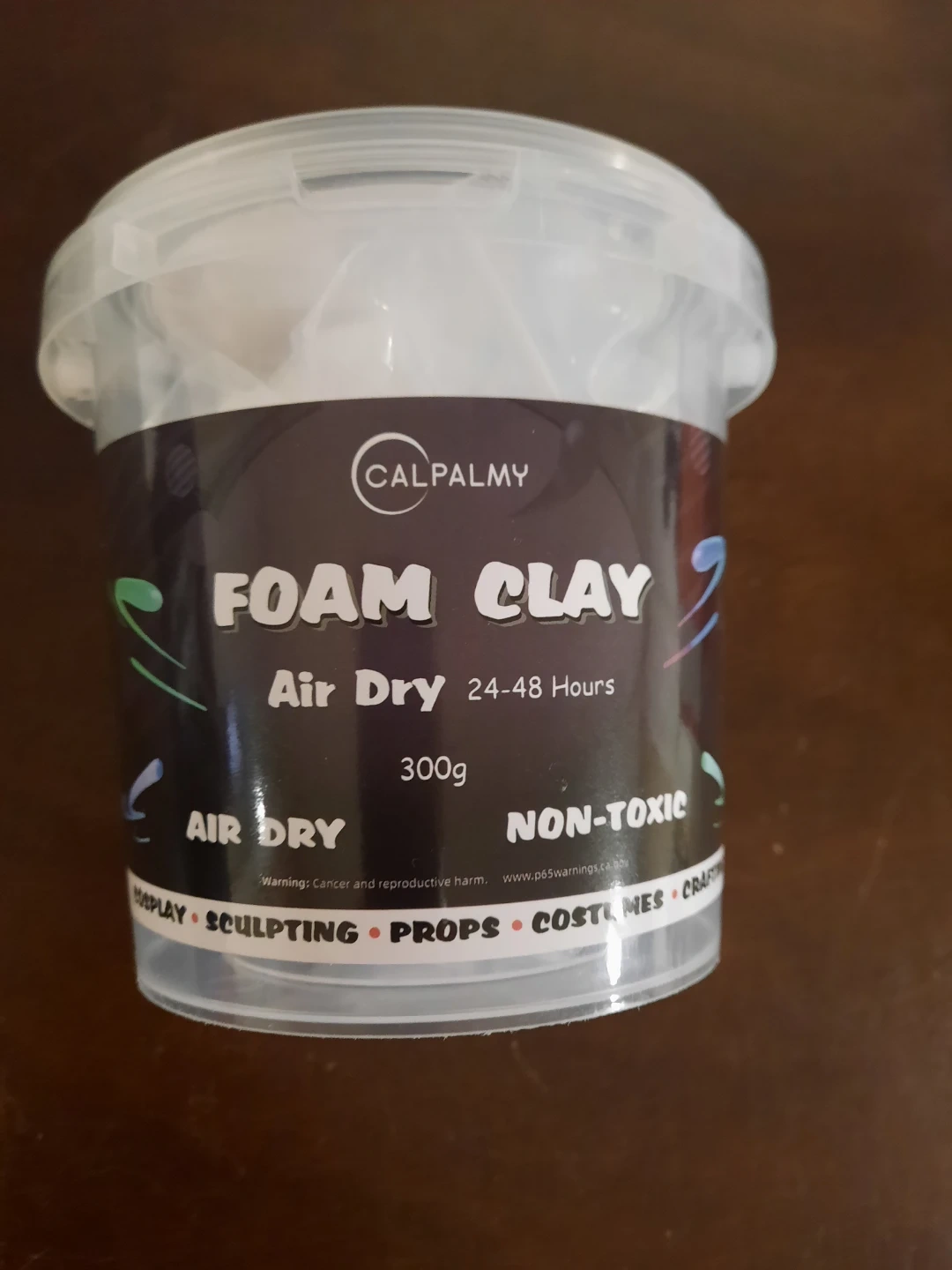 This is CalPalmy brand foam clay. It's air dry and takes 24-48 hours to dry. The container holds 300g of clay and it's non-toxic. This clay is suitable for play, sculpting, props, and costumes.